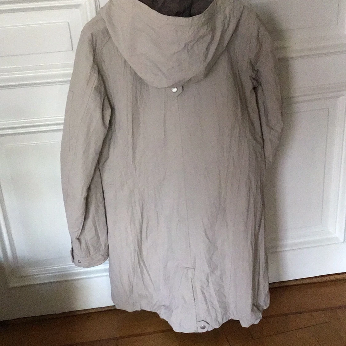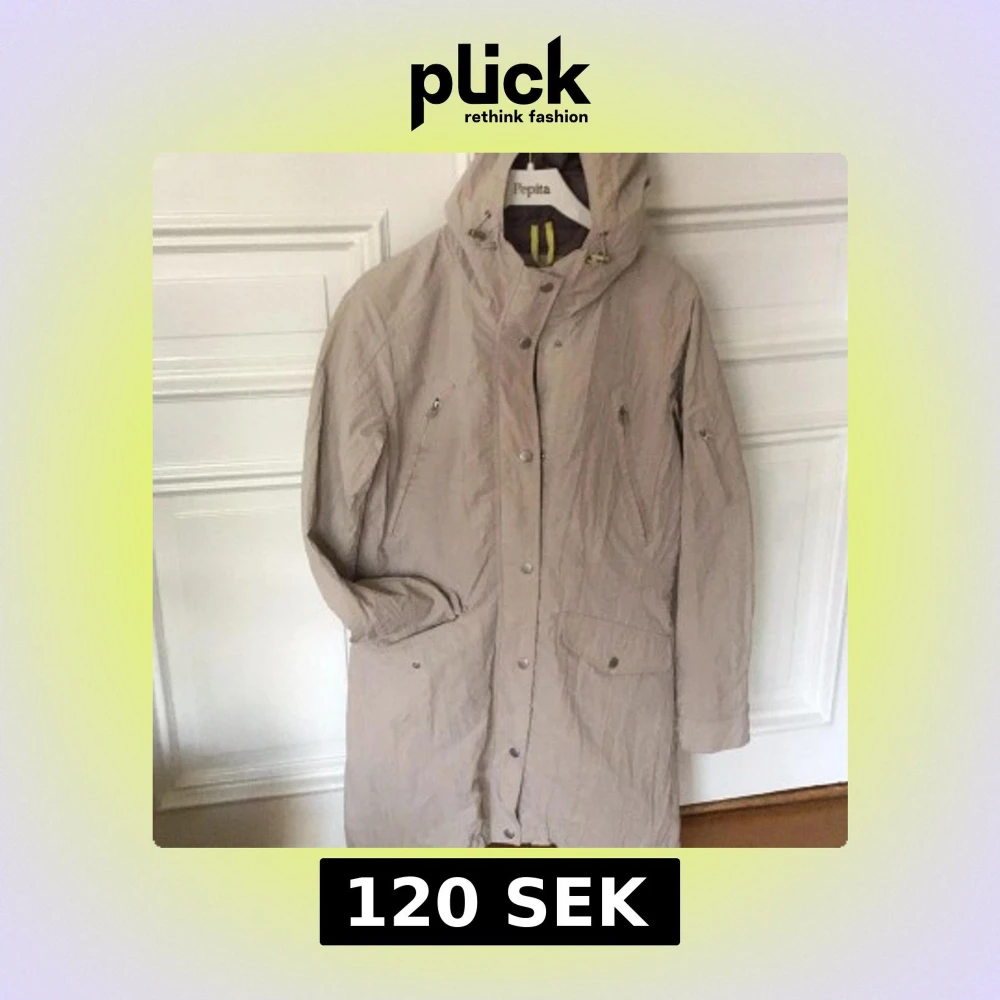 Säljer en stilren beige kappa från Lindex med huva och dragkedja. Jackan har långa ärmar och flera praktiska fickor med knappar. Perfekt för kyligare dagar.