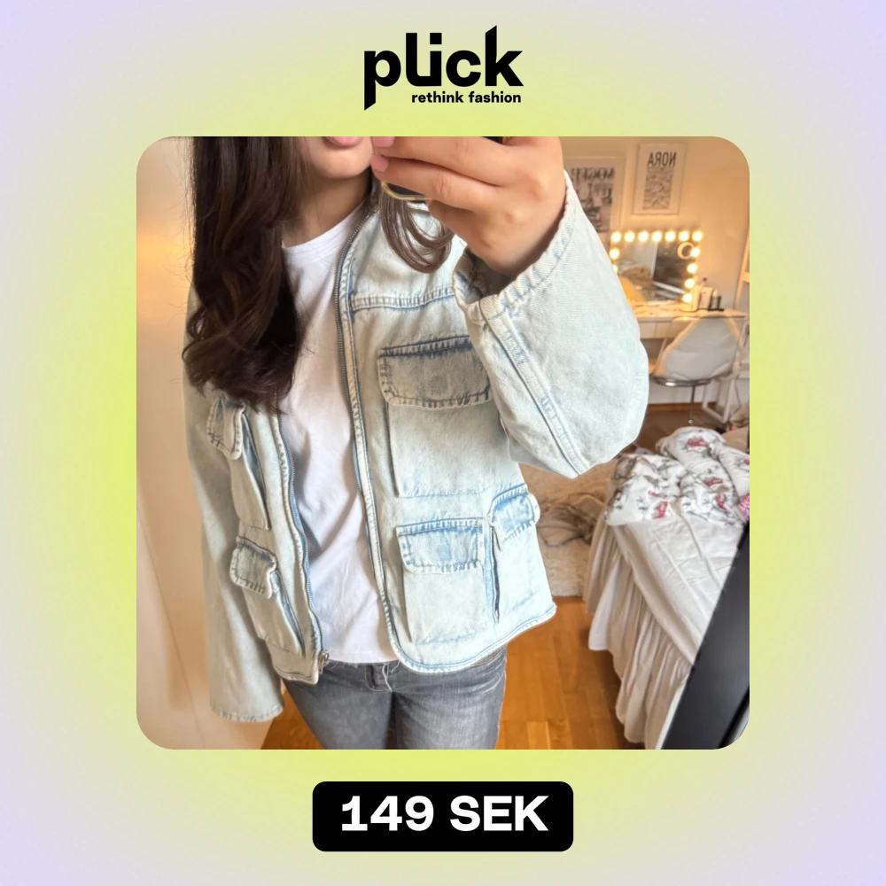 Ljusblå jeansjacka - Säljer en snygg ljusblå jeansjacka som jag köpt här på Plick som jag aldrig använt eftersom jag tycker den satt lite stort på mig. Bilderna är från tidigare säljare!❤️❤️