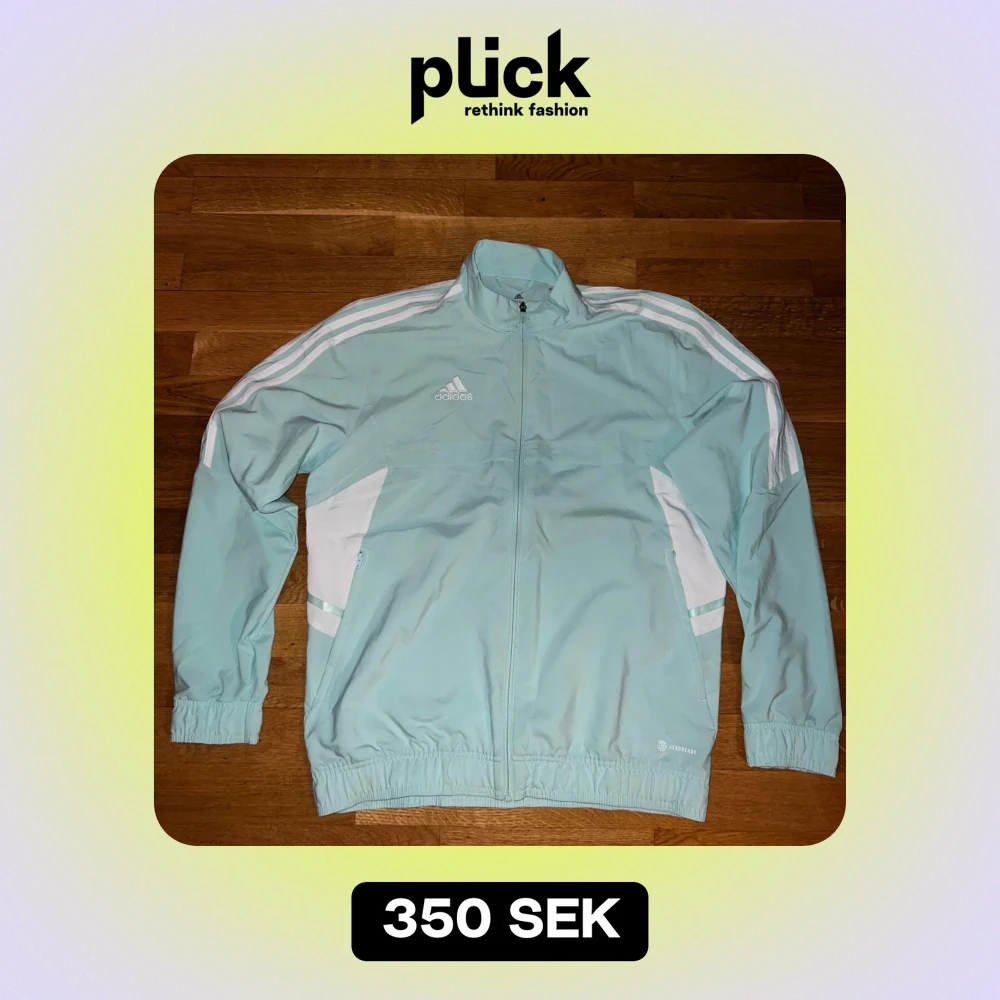 Säljer en ljusblå vindjacka från Adidas i mycket bra skick. Jackan har dragkedja och långa ärmar med vita detaljer och Adidas-logga på bröstet. Perfekt för träning eller som en lätt jacka till vardags.