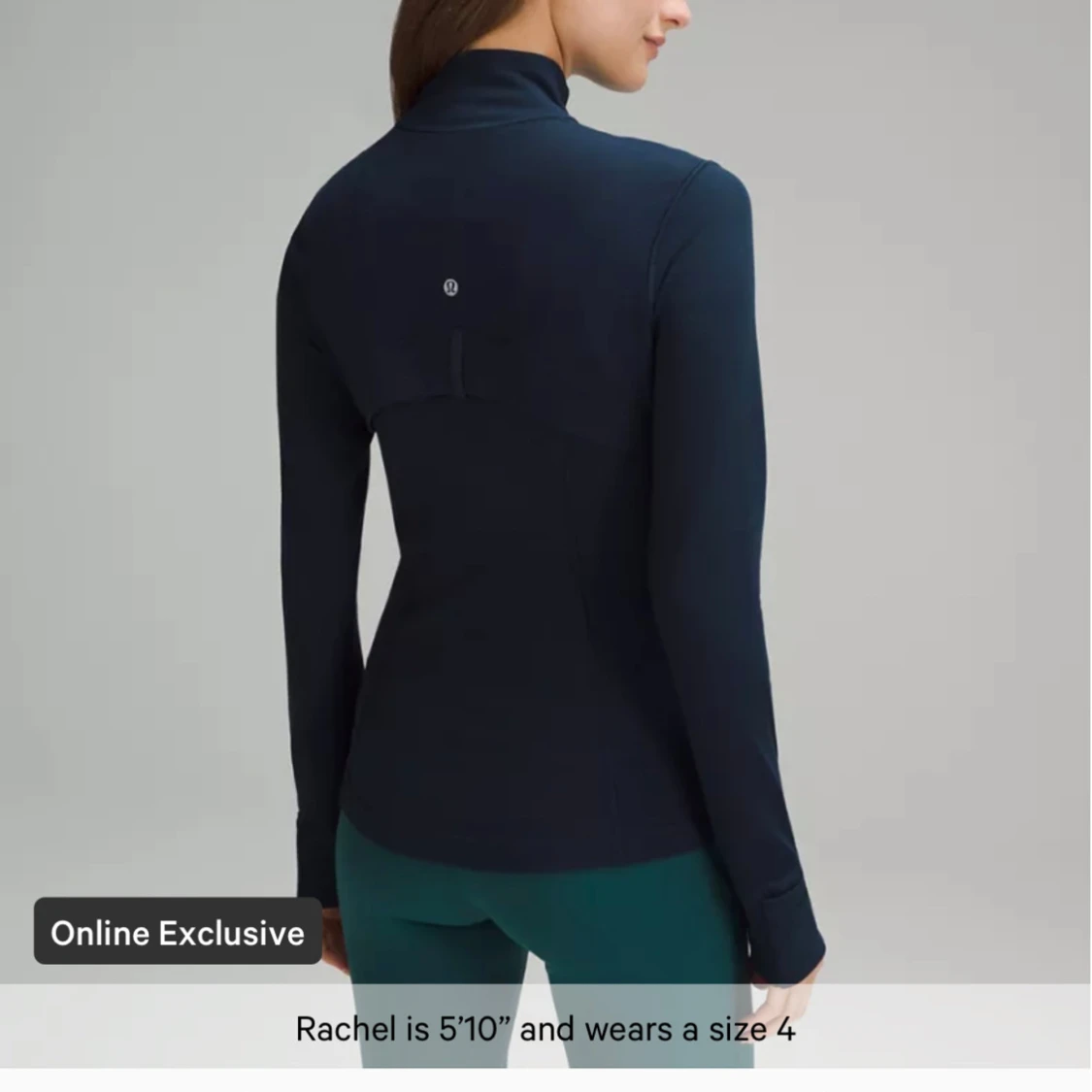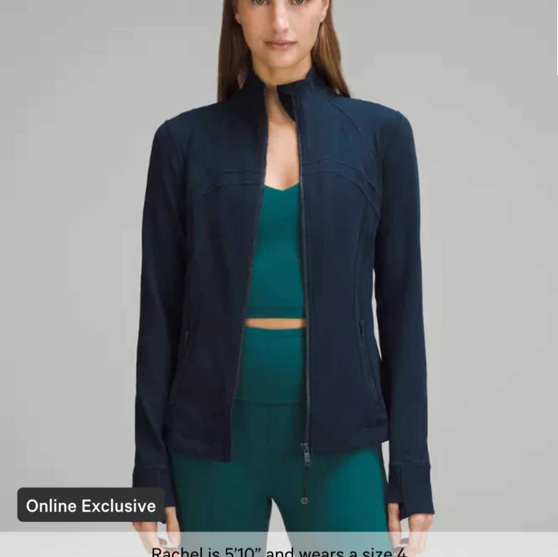 Snygg marinblå träningsjacka från Lululemon med hög krage och hel dragkedja framtill. Jackan har långärmad design med tumhål och figurnära passform. Perfekt för gymmet eller powerwalks, med diskret logga på ryggen.