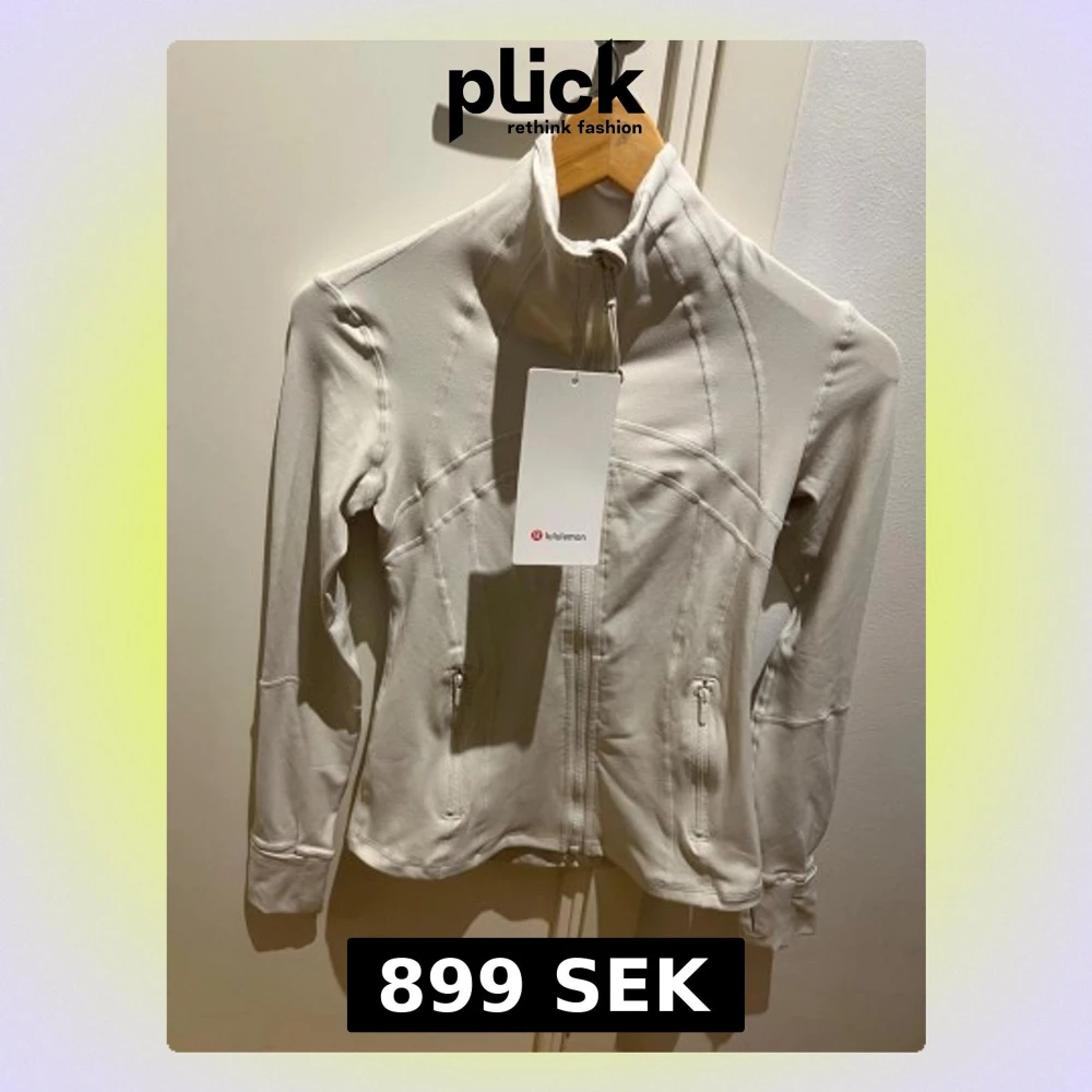 Snygg vit träningsjacka från Lululemon med figurnära passform, hög krage och dragkedja framtill. Jackan har praktiska fickor med dragkedja och coola sömdetaljer. Materialet är mjukt och stretchigt polyester, perfekt för aktiva dagar.