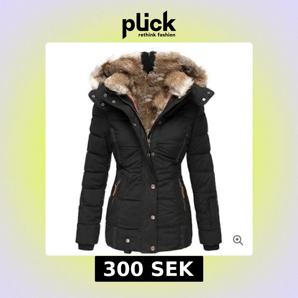 Svart pufferjacka med mysig fuskpäls i huvan och snygga detaljer i brons. Jackan har dragkedja och knappar framtill, två fickor med dragkedja och figurnära passform. Perfekt för kalla dagar när du vill hålla stilen.Ståt storlek xl men liten i storlek som en M