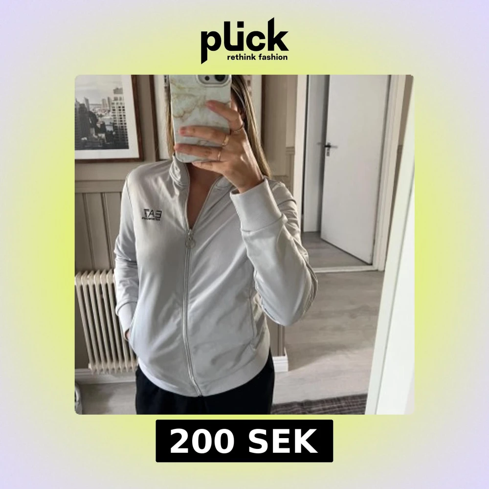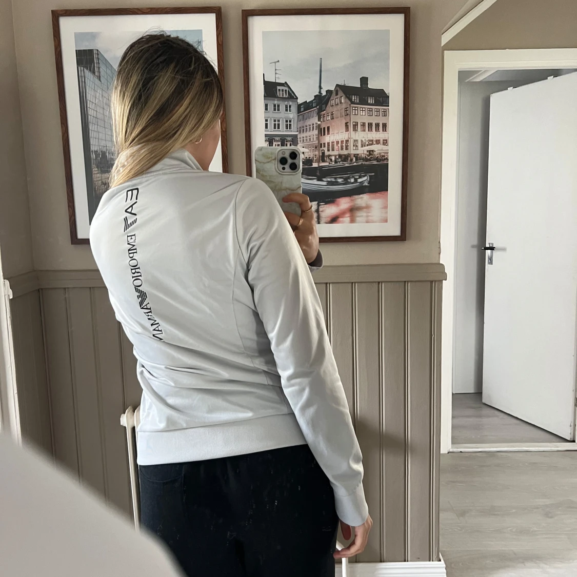 Snygg vit zip-jacka från Emporio Armani med EA7-logga på bröstet och längs ryggen. Liten i storleken.