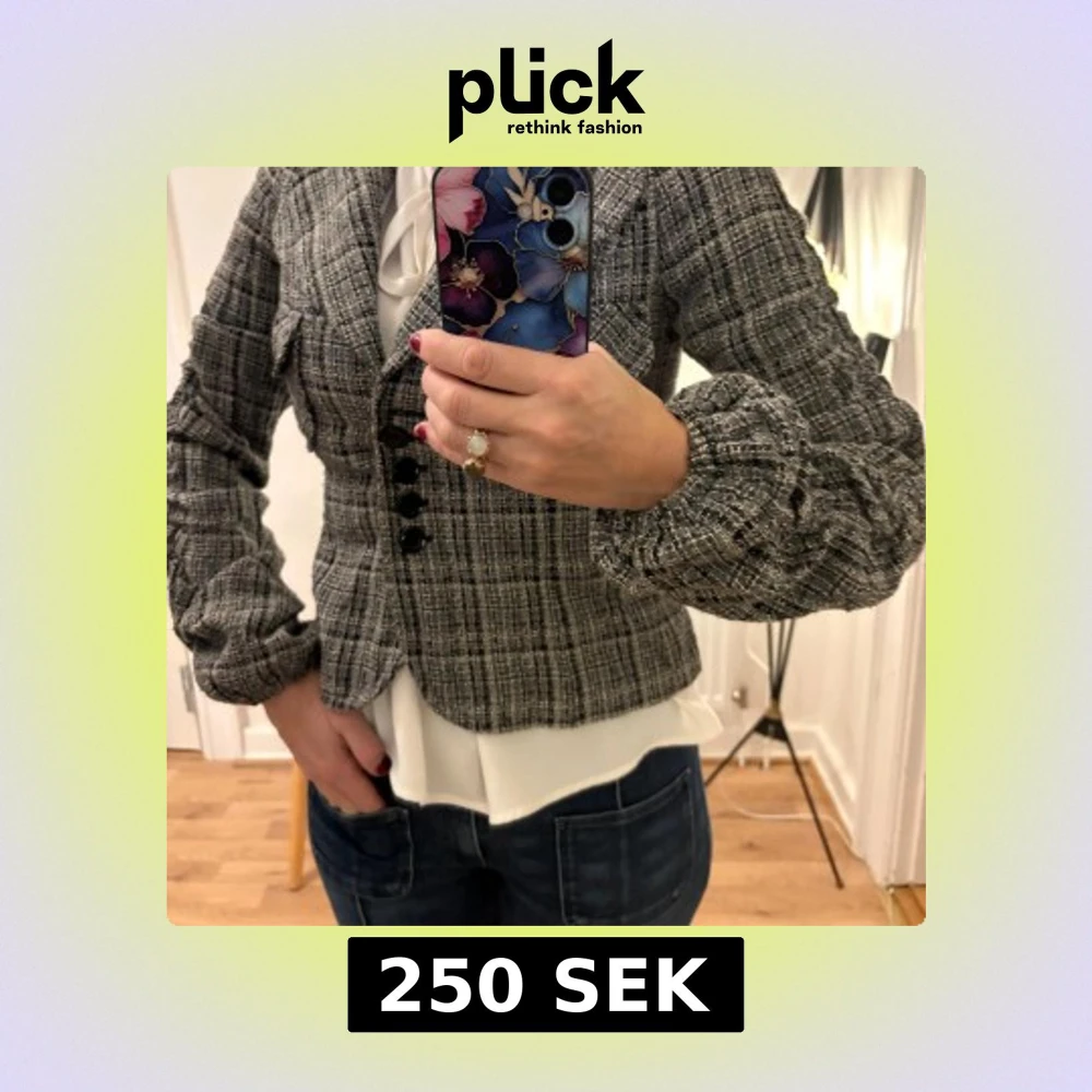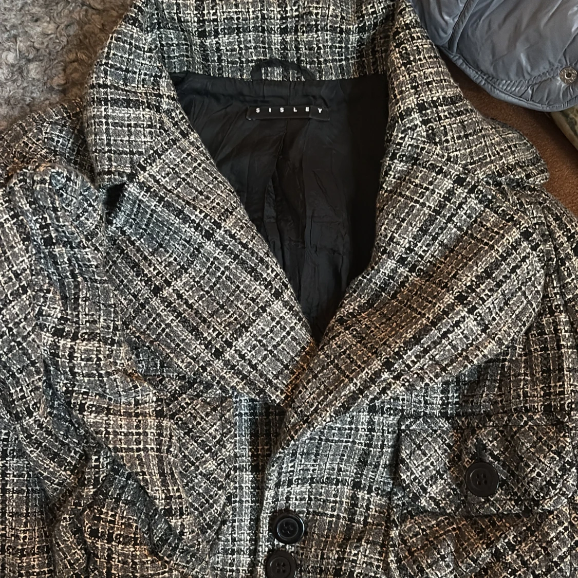 Säljer en snygg rutig kavaj från Sisley i svart, grått och vitt. Jackan har markerad krage, knappar framtill och puffiga långärmar. Materialet är grovt vävt och ger en cool, strukturerad look. Perfekt för dig som gillar att sticka ut med din stil.