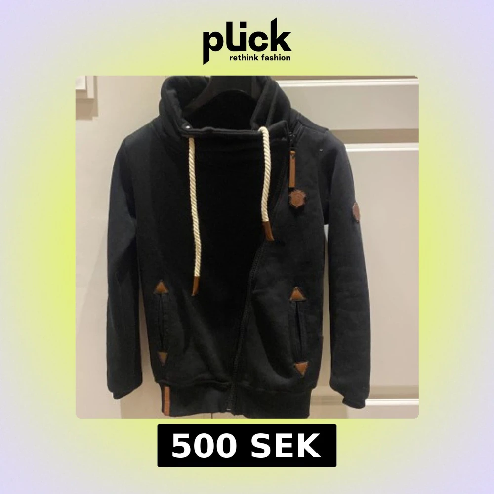Säljer en svart huvtröja från Naketano med dragkedja och vita snören i huvan. Tröjan har bruna läderdetaljer och en logotyp på ärmen.