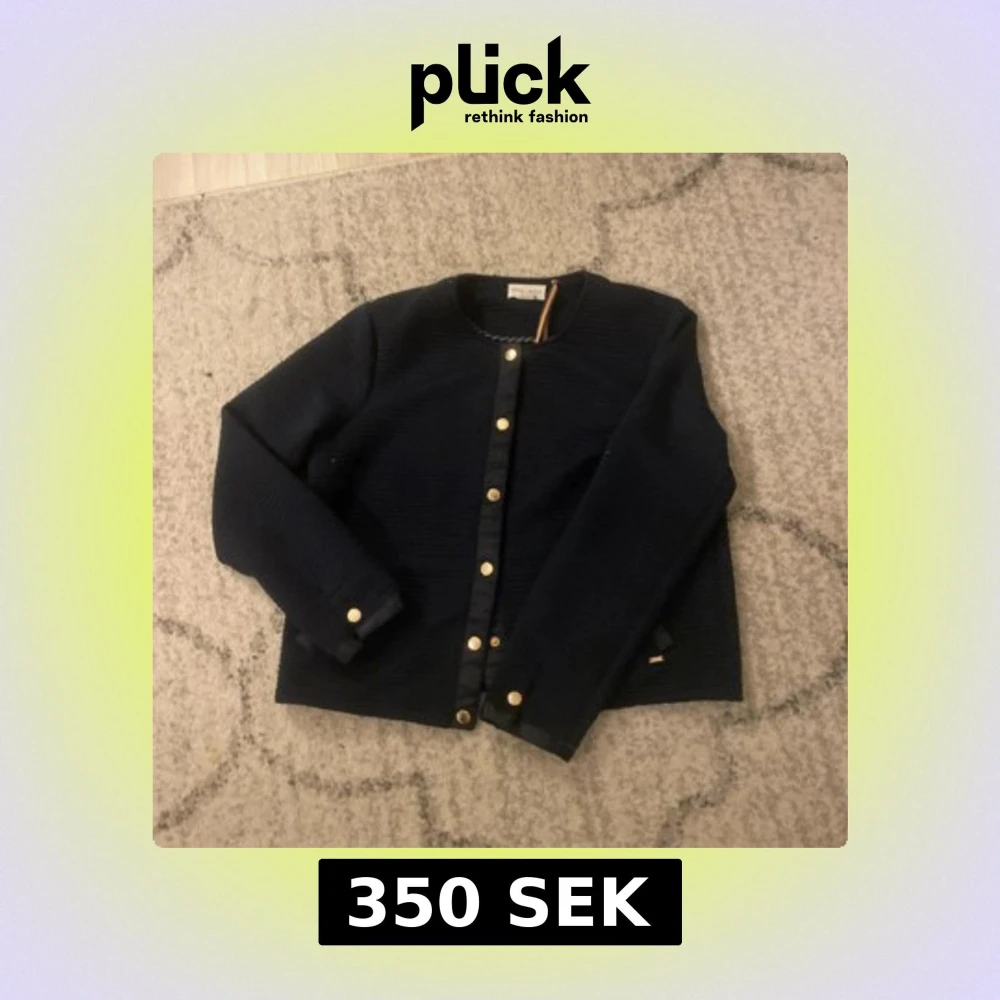 Snygg mörkblå cardigan jacka från Holly & Whyte by Lindex med guldfärgade knappar framtill och vid ärmslut. Jackan har rund halsringning och är långärmad, perfekt för att ge din outfit en stilren touch.