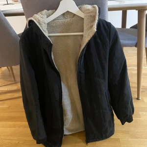 Säljer en svart jacka med mysigt teddyfoder. Jackan har en dragkedja framtill och långa ärmar. Perfekt för kyliga dagar när du vill hålla dig varm och bekväm. 🖤