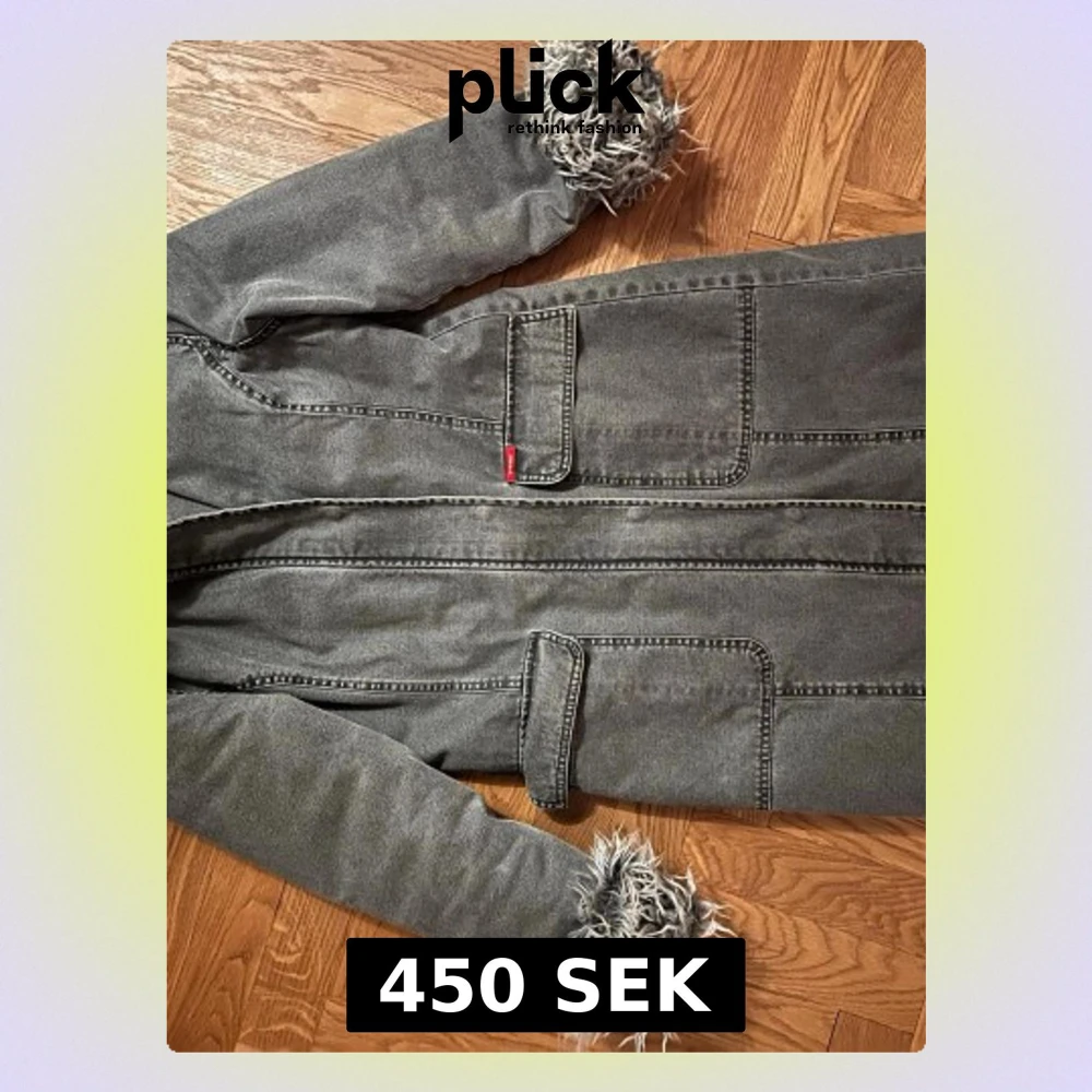 Säljer en grå lång jeansjacka från XX BY MEXX med fluffiga pälsdetaljer i grått vid krage och ärmslut. Jackan har stora fickor framtill och stängs med dragkedja. Perfekt för dig som vill sticka ut med en unik och cool look.