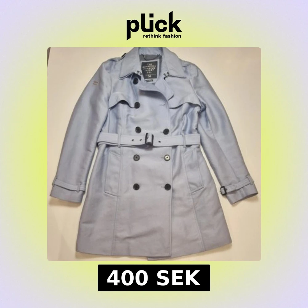 Snygg ljusblå kappa från The Superior Premium Jacket Co. med klassisk dubbelknäppning, bälte i midjan och svarta knappar. Jackan har långa ärmar och detaljer vid ärmslut samt axlar.