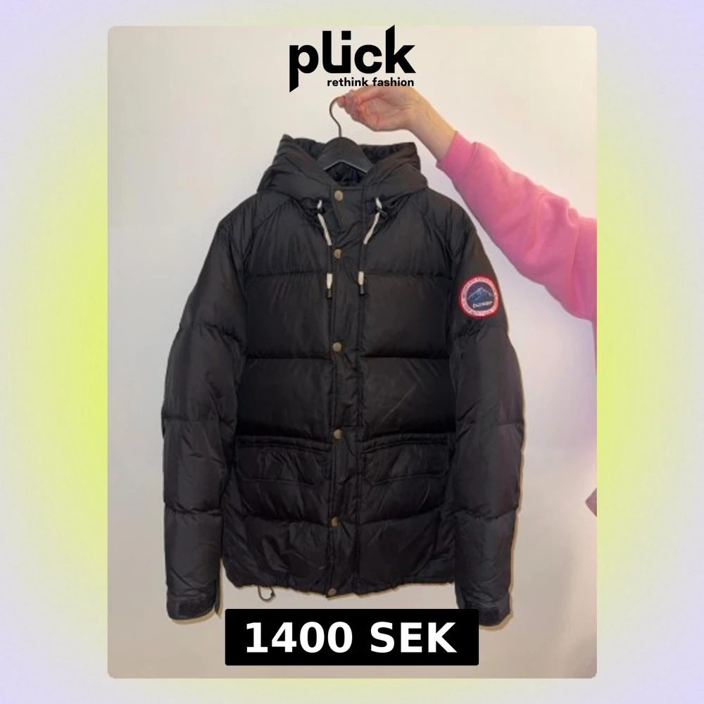 Svart pufferjacka från Tuxer med huva och snörning, storlek M. Jackan har ett broderat märke på ärmen, stora fickor framtill och knappar längs öppningen. Perfekt för kalla dagar med sin tjocka och quiltade design. Snygg och funktionell look. Mycket fint skick, är sparsamt använd.