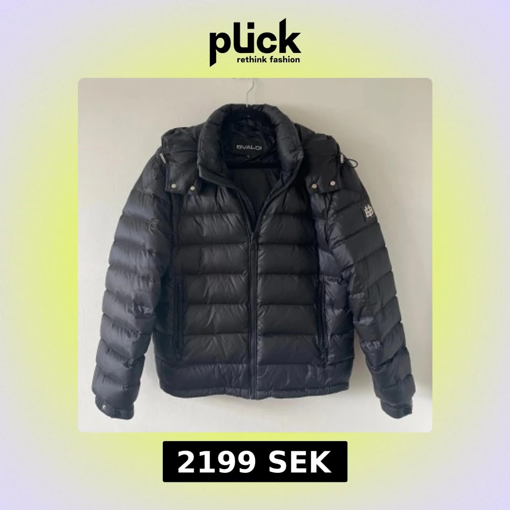 Säljer en svart pufferjacka från BVALDI med huva och coolt metallmärke på ärmen. (luva går att ta av)
