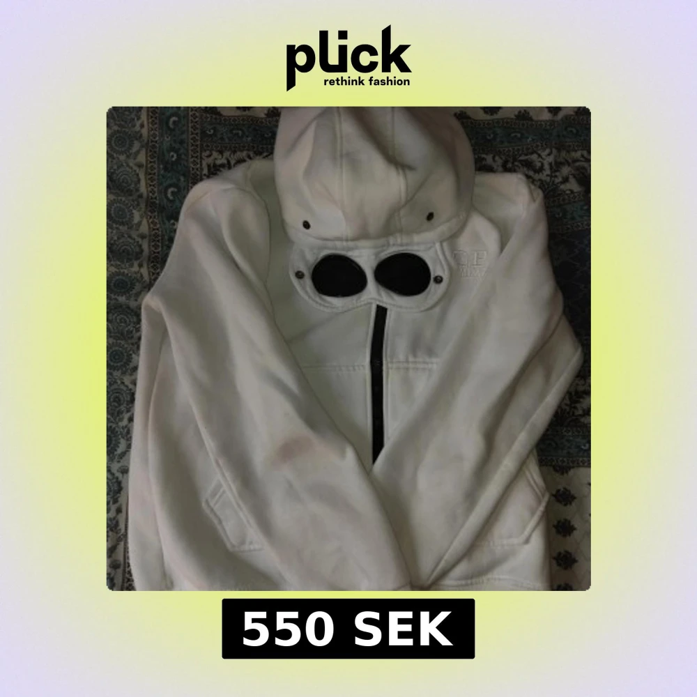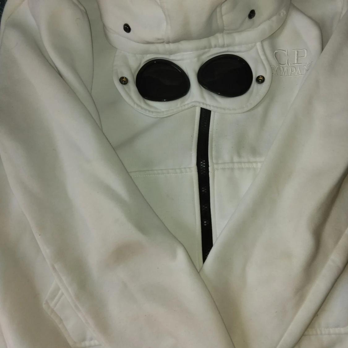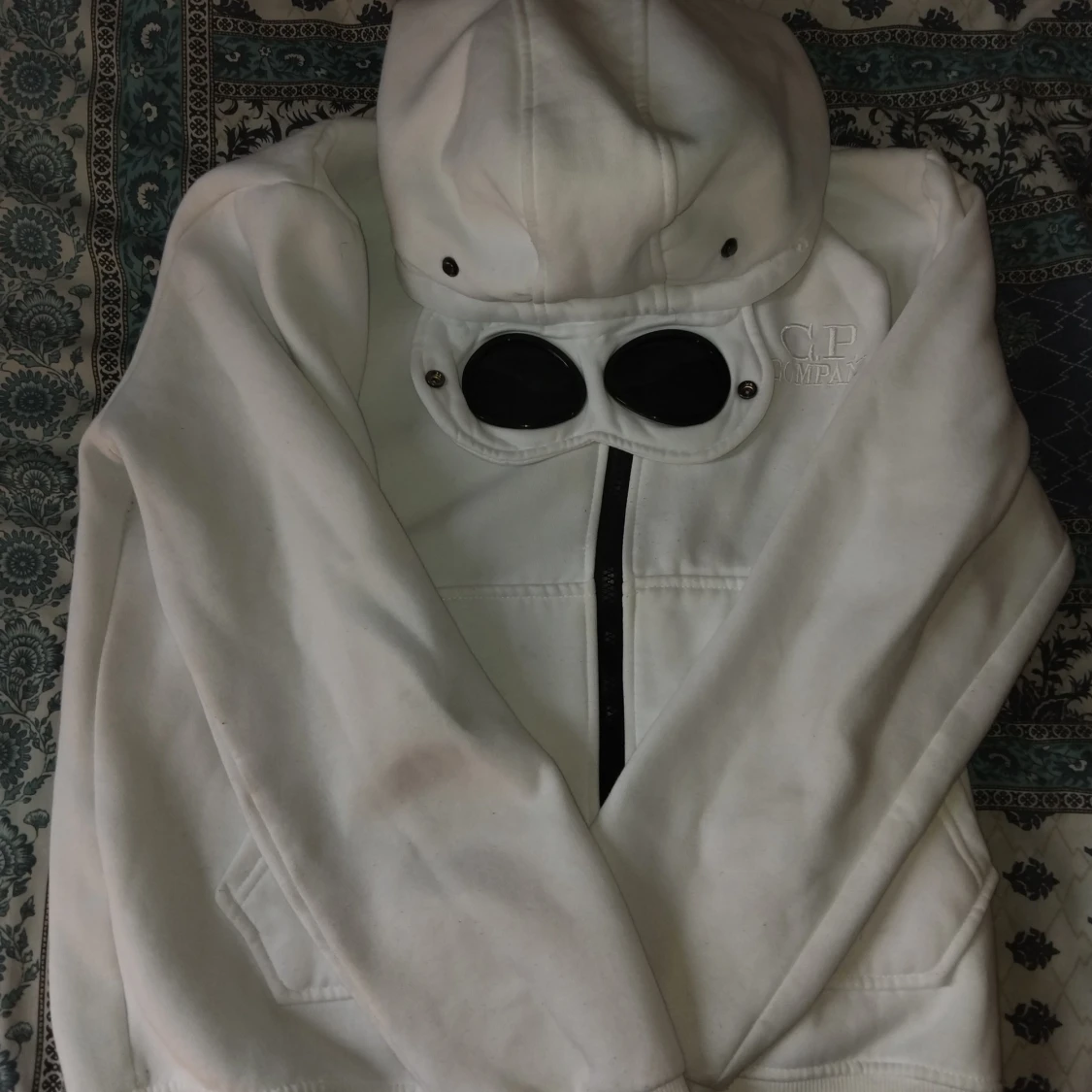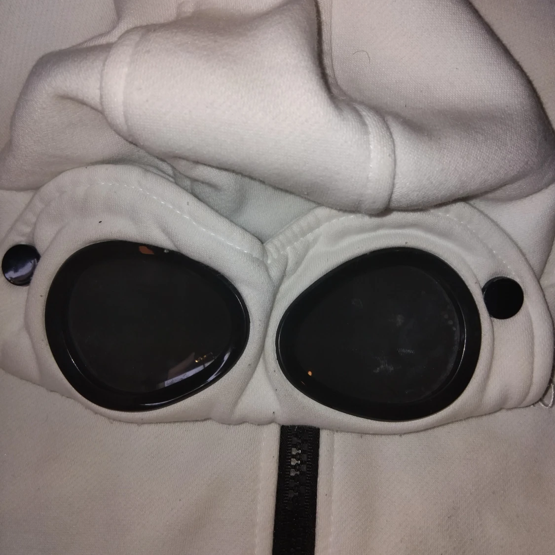 Säljer en vit gogglejacka från C.P. Company med ikoniska svarta glasögon i huvan och broderad logga på bröstet. Jackan har dragkedja framtill och är tillverkad i ett mjukt bomullsmaterial. Perfekt för dig som vill sticka ut med en unik streetwear-look.