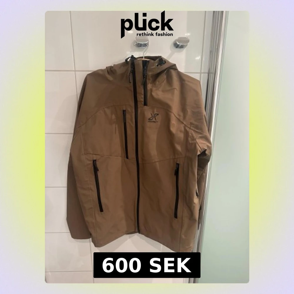 Brun vindjacka från RevolutionRace i färgen dark olive med huva, flera svarta dragkedjor och RECCO-teknologi. Jagkan är för män men passar även mig som är tjej. Jackan har en clean look, praktiska fickor och är tillverkad i slitstark polyester. Perfekt att åka skidor i. Finns en hel del invändigt slitage vilket syns på bilderna!