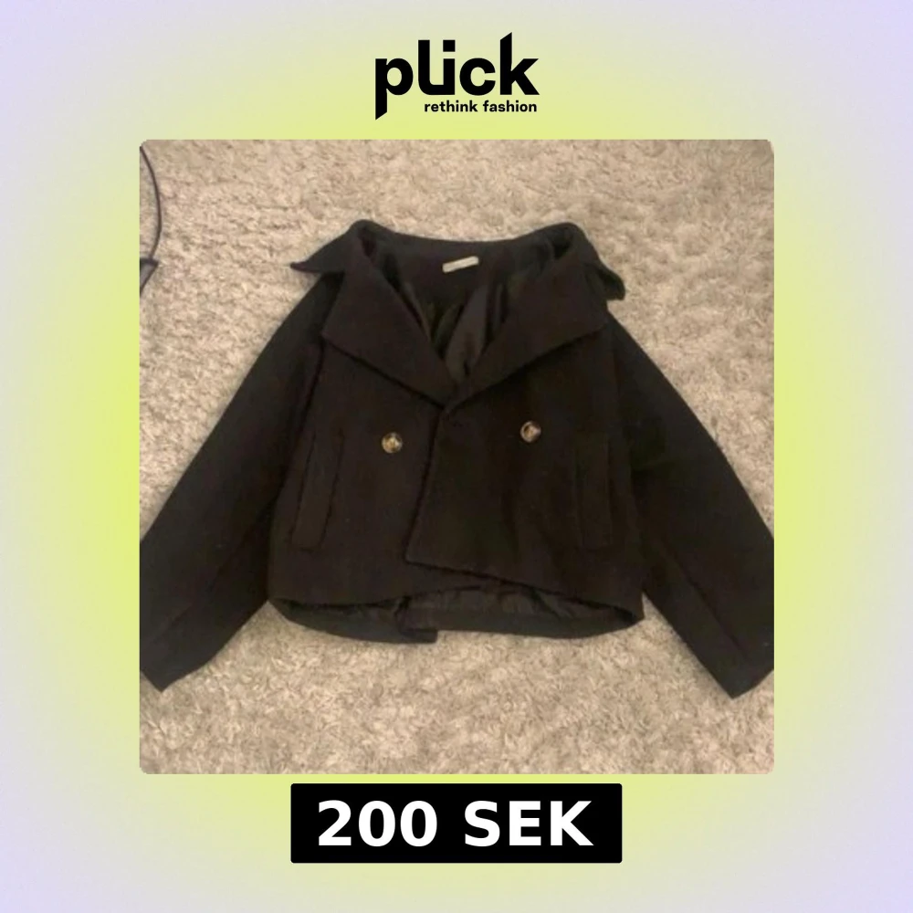 Säljer en svart kappa med bred krage och dubbelknäppning framtill. Jackan har två fickor och är något croppad i modellen. Perfekt för dig som vill ha en stilren och klassisk look.