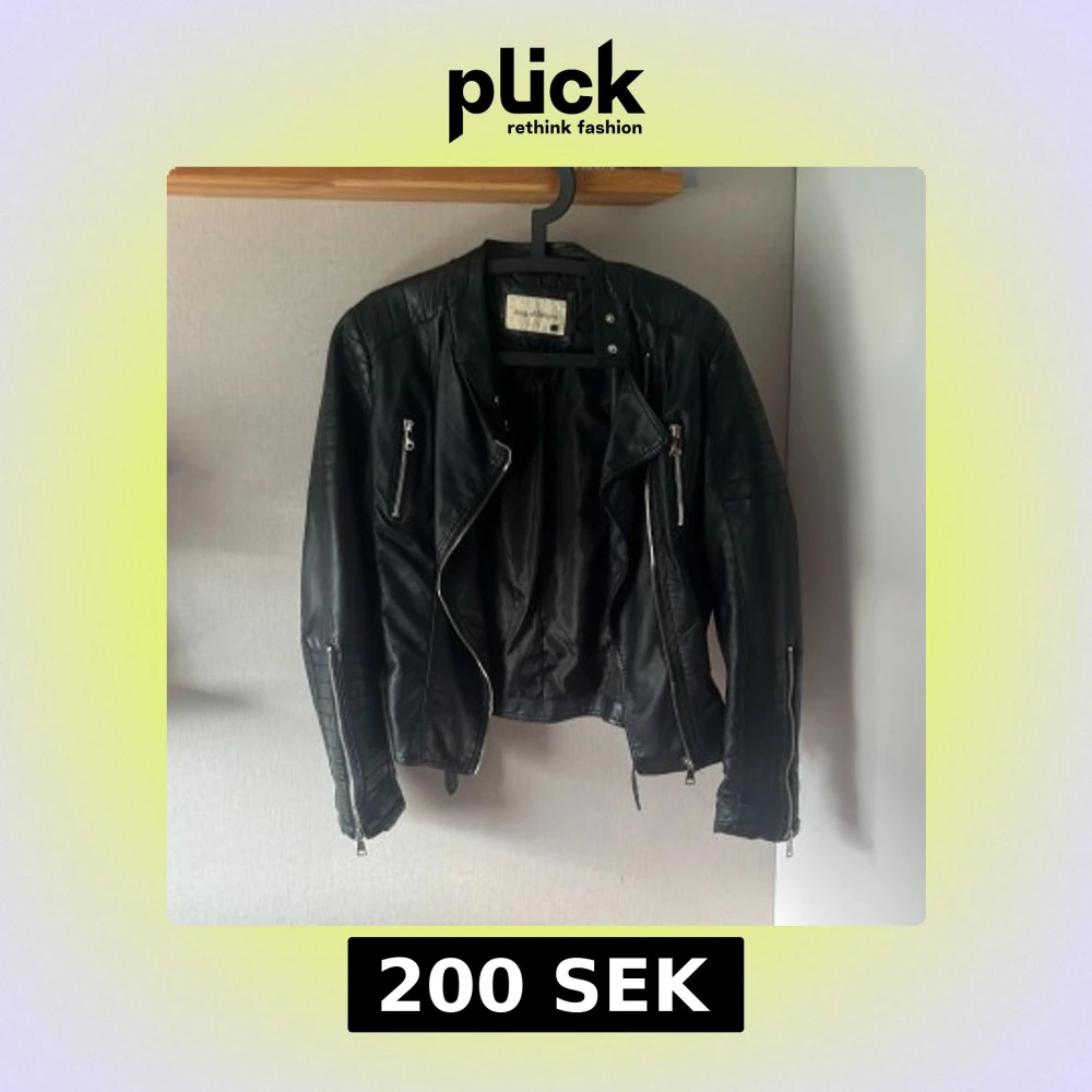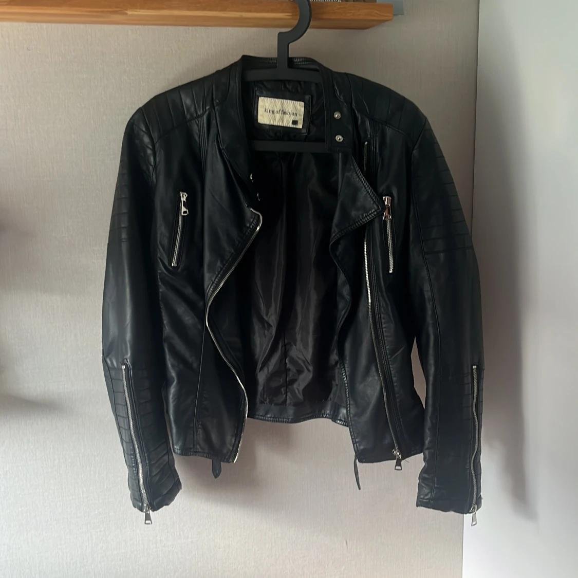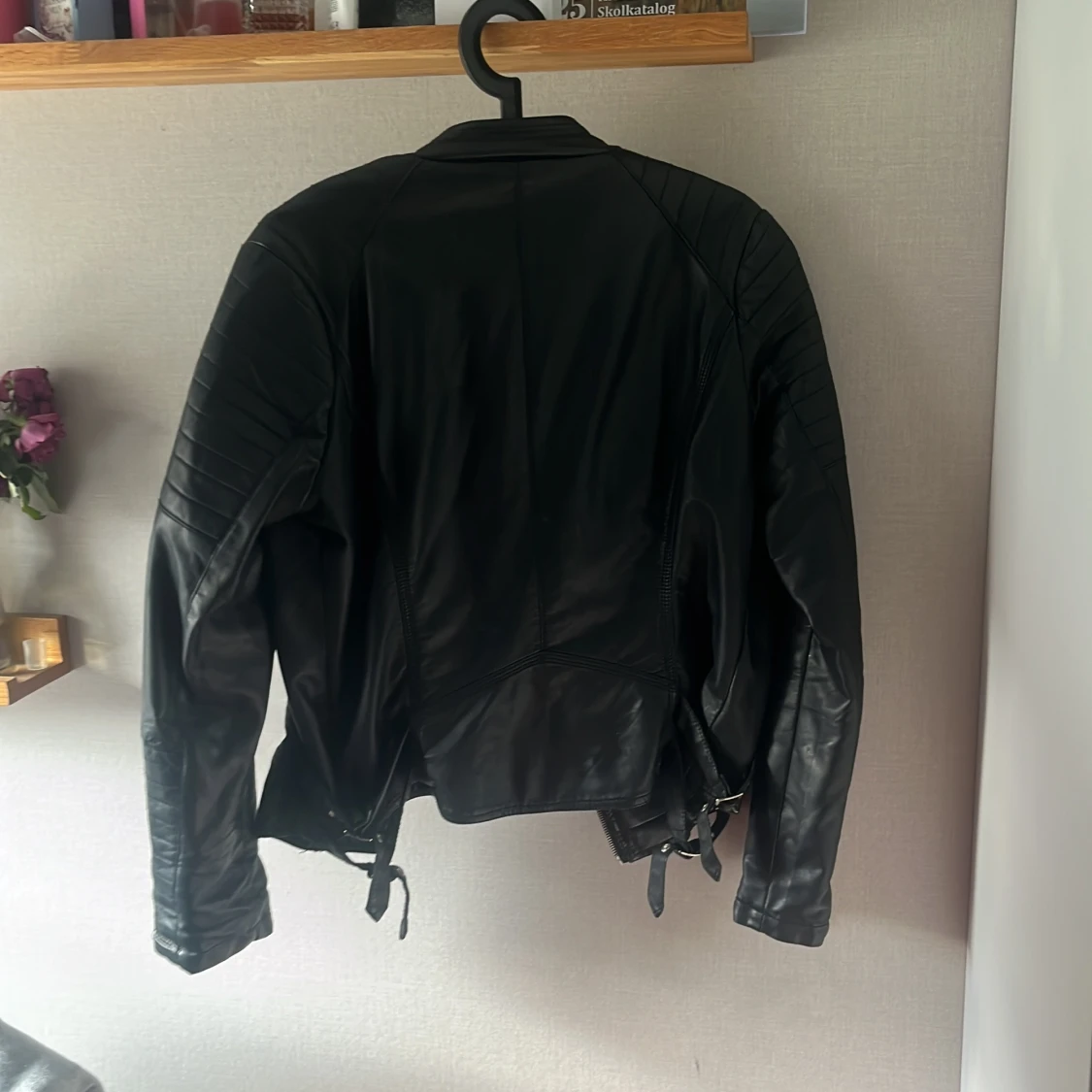 Snygg svart skinnjacka med coola detaljer som dragkedjor på ärmar och bröst, samt quiltade partier på axlarna. Jackan har klassisk bikerstil med sned dragkedja och flera fickor. Perfekt för dig som vill ha en edgy look. Storleken är XL men passa mig o min kompis som har S/M, den har ett hål inne i jackan i de tunna lagret men inget som syns när den är på.