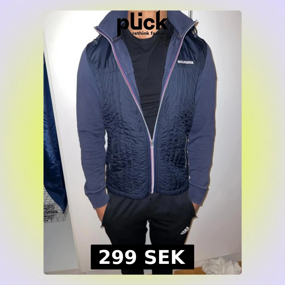 Snygg mörkblå quiltad bomberjacka från Hilfiger med dragkedja i regnbågsfärger och huva med snörning. Jackan har långärmade bomullsärmar och två fickor med dragkedja. Perfekt för dig som gillar sportig och stilren look. Ett hål vid ena armen och målarfärg under cuffen.