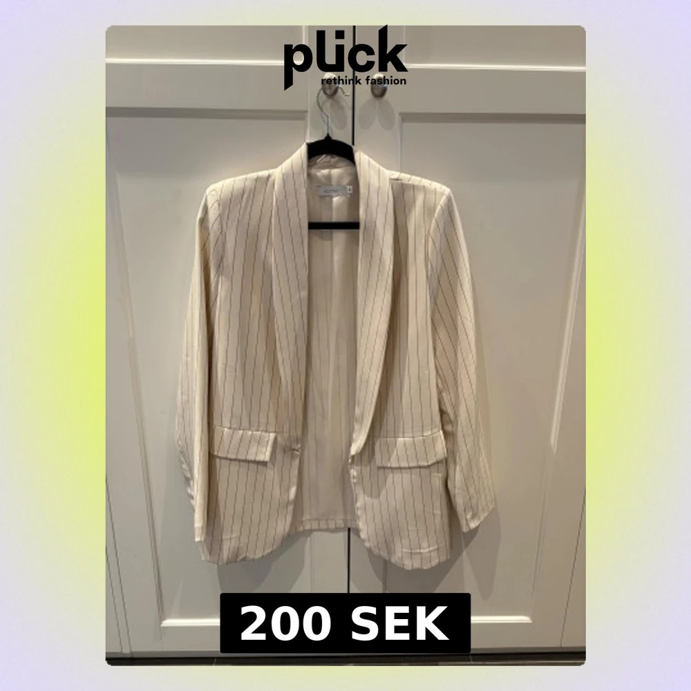 Snygg beige kavaj från Sorbet med tunna svarta ränder. Klassisk passform med två fickor framtill och lång ärm. Perfekt för dig som vill ha en stilren och trendig look. Tunn och lätt i materialet, passar året runt.