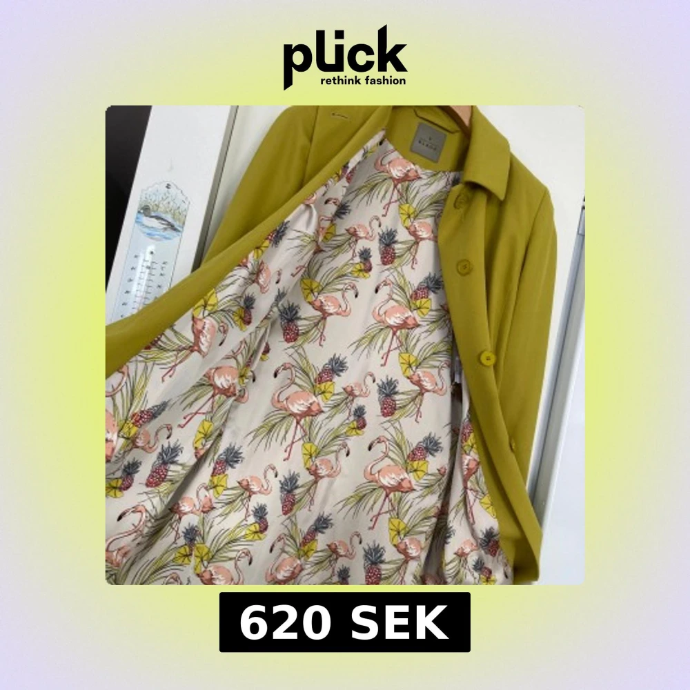 Elegant olivgrön kappa från Fuchs Schmitt med ett färgglatt foder prytt av flamingos och ananas. Kappan har en klassisk krage och knäpps med knappar framtill. Den har ett bälte i midjan för en smickrande passform.