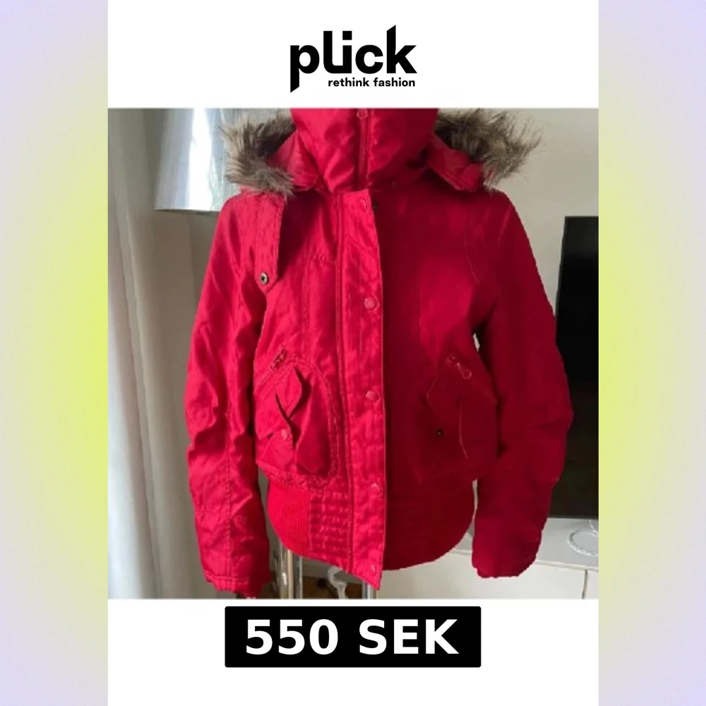 Säljer en röd parkajacka med huva och fuskpälsdetalj. Jackan har dragkedja och knappar framtill, samt praktiska fickor med både knapp och dragkedja. Ribbad mudd nedtill och vid ärmslut för extra komfort. Perfekt för kyliga dagar.