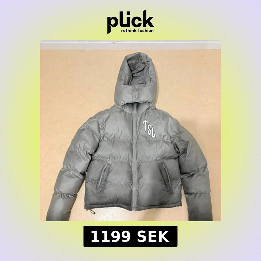 Snygg grå pufferjacka från Trapstar med broderad 'London Shooters'-logga på ryggen och TSL-tryck på bröstet. Jackan har hög krage, huva, dragkedja och två fickor framtill. Perfekt för kalla dagar och streetwear-stil.