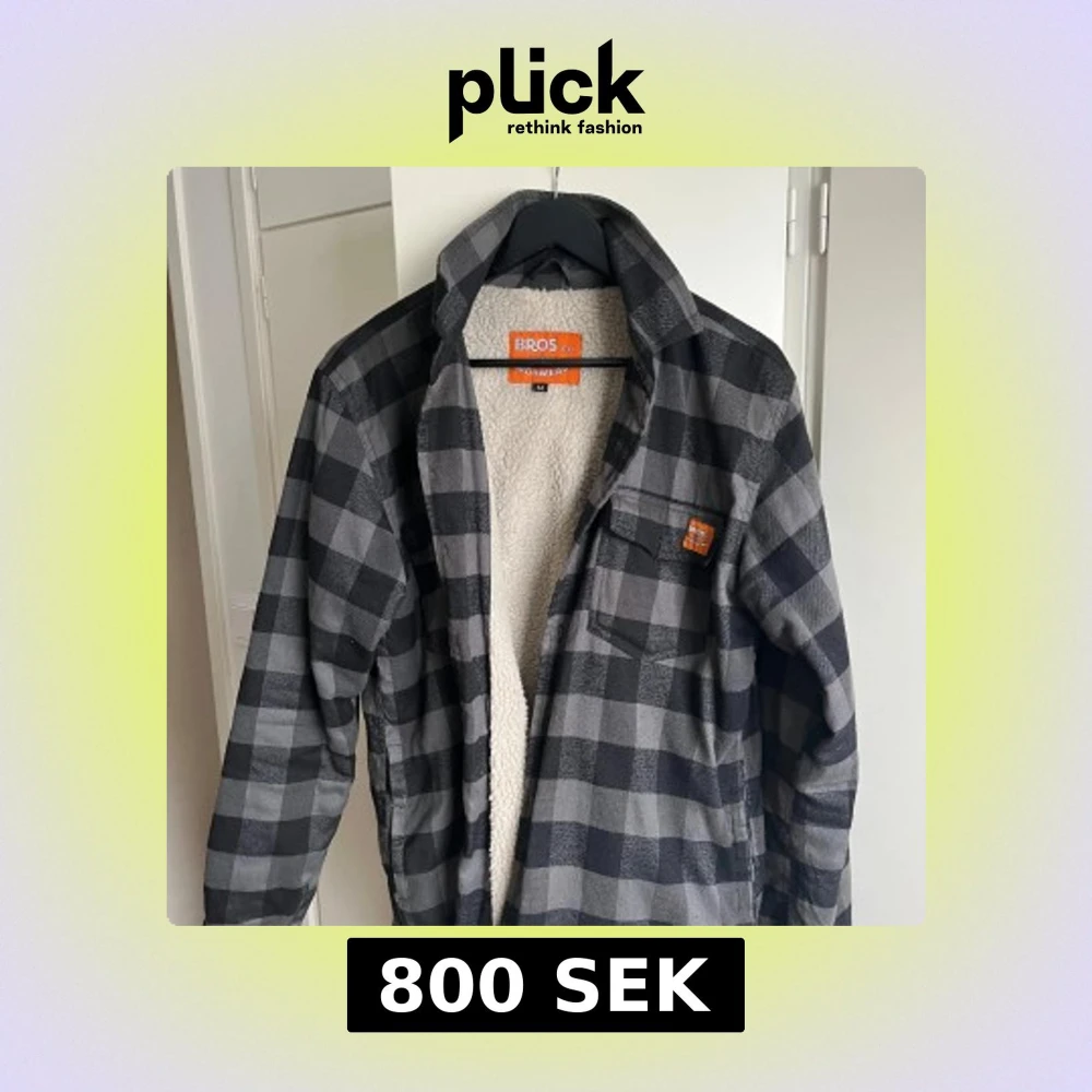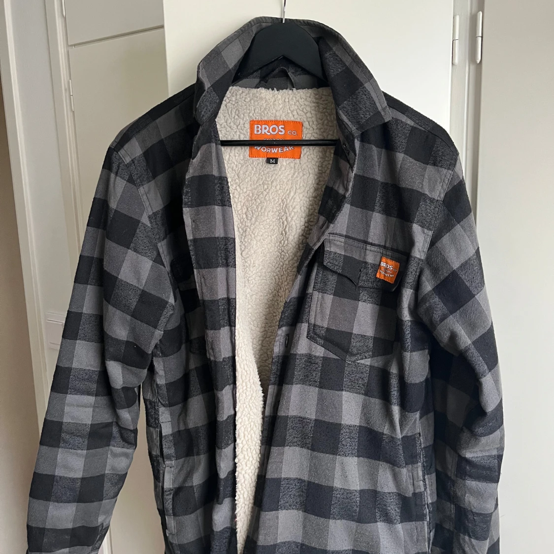 Säljer en snygg svart och grå rutig jacka från Bros med mjukt fleecefoder. Jackan har långa ärmar och en praktisk bröstficka med knapp. Perfekt för kyliga dagar!