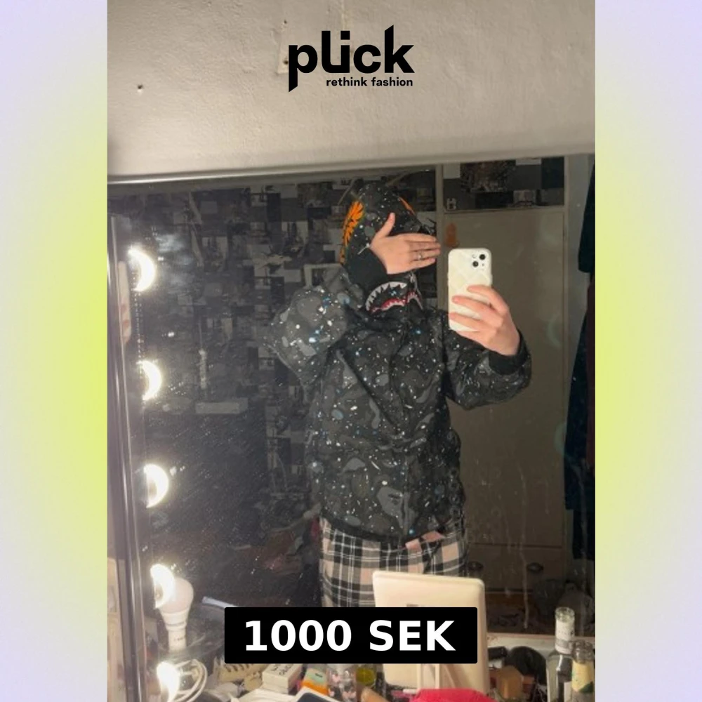 Säljer en svart BAPE Shark Camo vindjacka med ikonisk hajhuva, broderade detaljer och färgglada bokstäver på huvan. Jackan har dragkedja, camomönster med blå och vita stänk samt ribbade muddar. Perfekt för dig som vill sticka ut med streetwear-vibe. Helt äkta. Nypris 7000