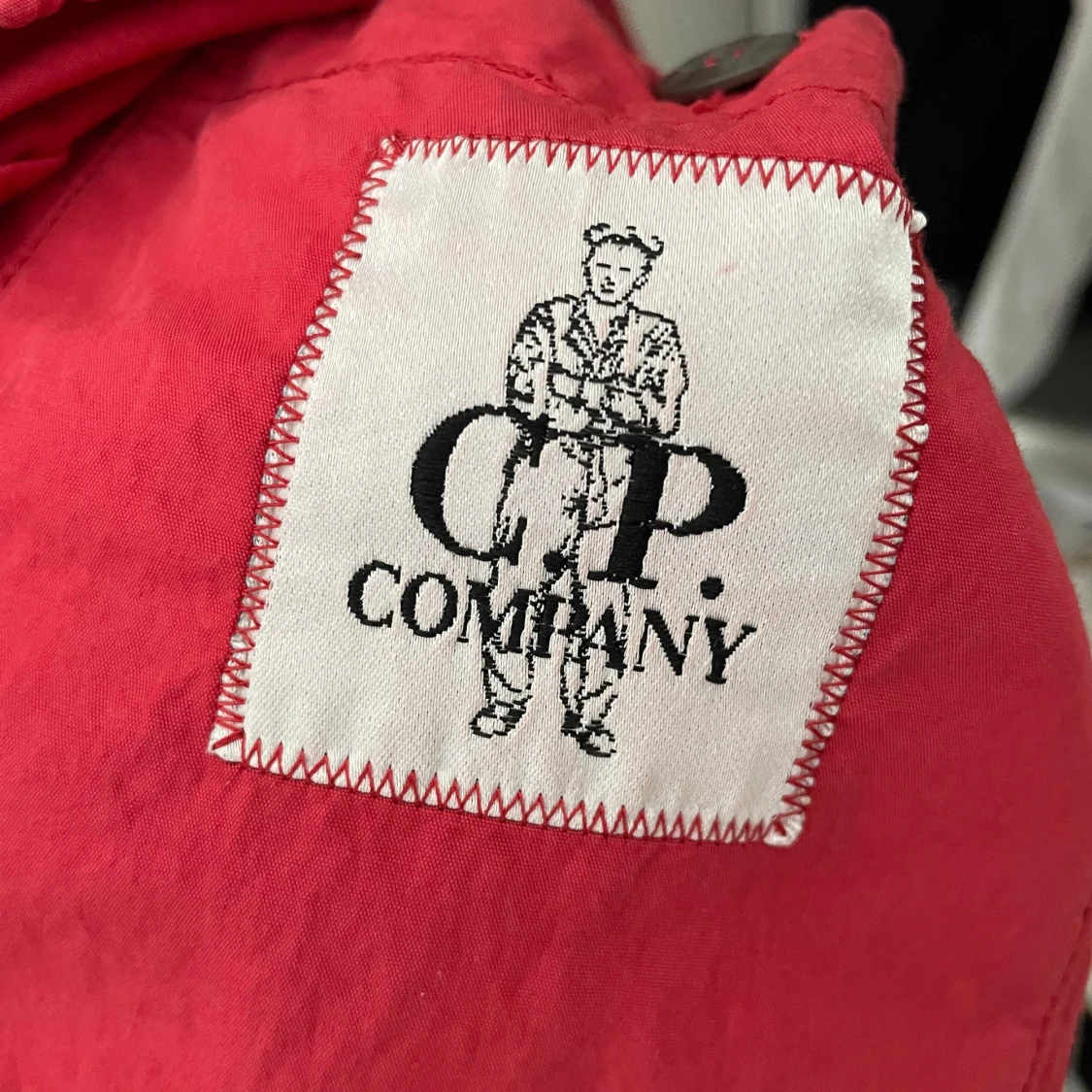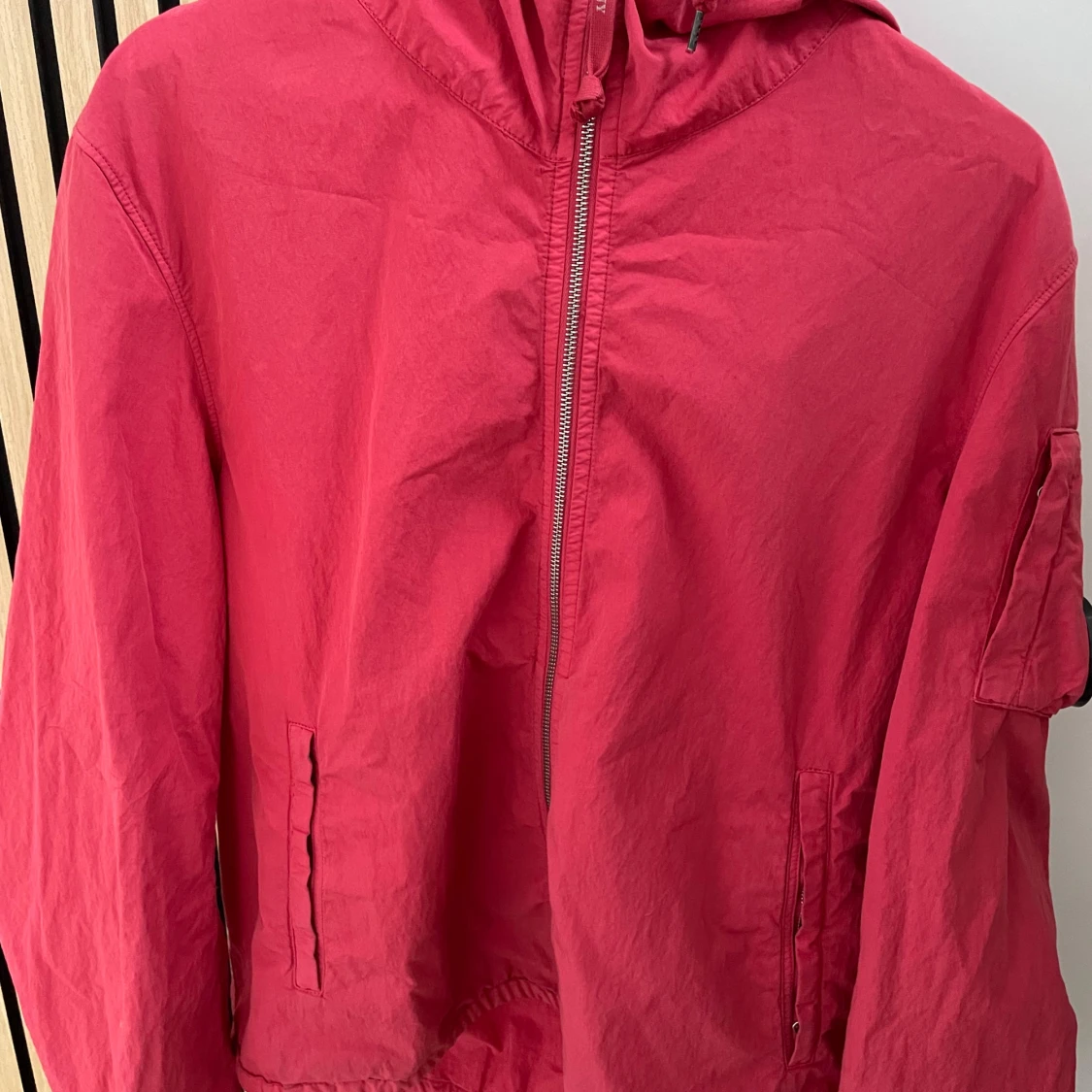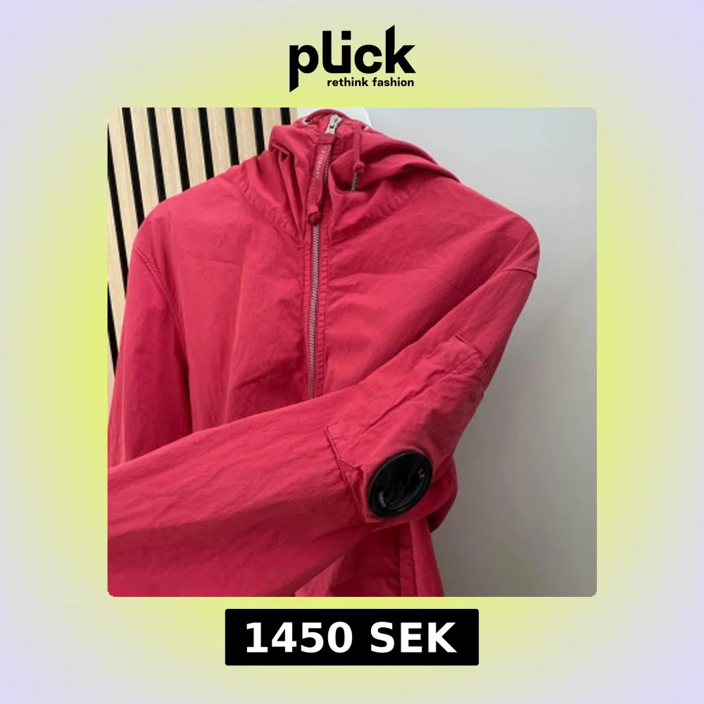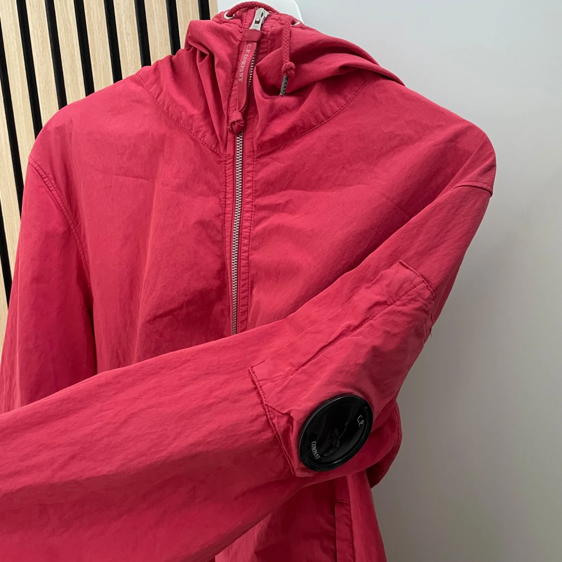 Säljer en röd vindjacka från C.P. Company med huva och dragkedja framtill. Jackan har en ikonisk linsdetalj på ärmen och två fickor med dragkedja. Str M