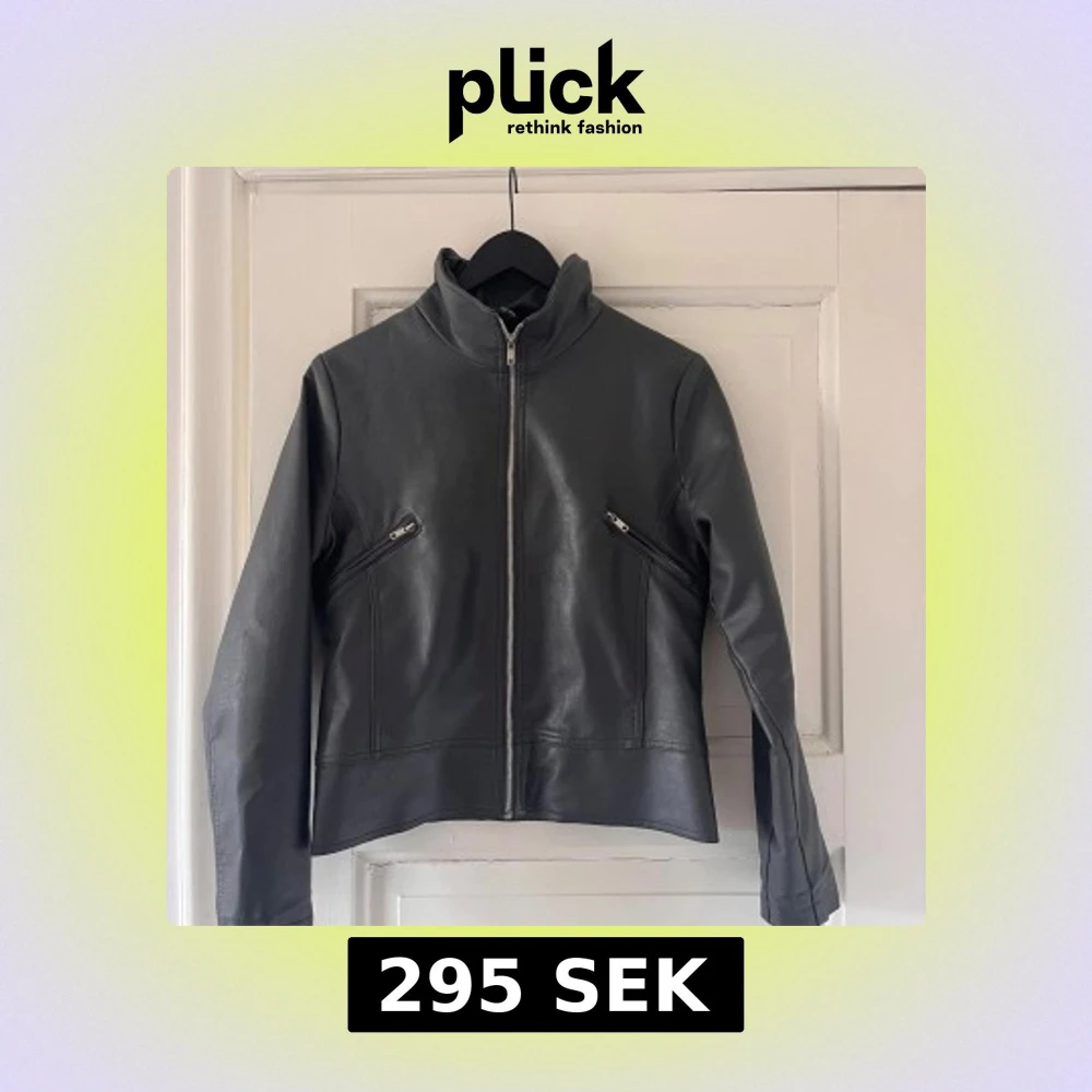 Snygg svart skinnjacka med dragkedja framtill och två snedställda fickor med dragkedjor. Jackan har en hög krage och en figurnära passform som ger en stilren look. Står ej storlek men ca en M❤️