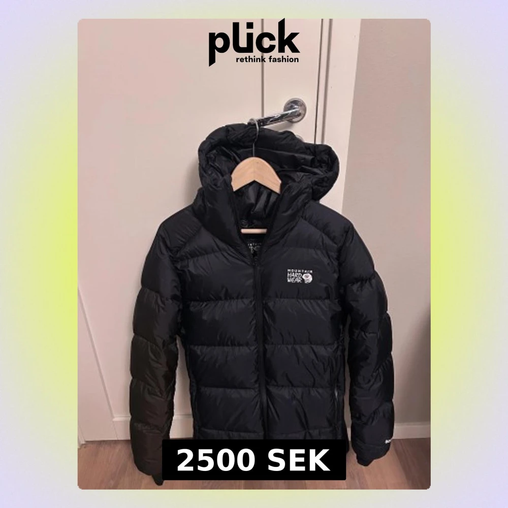 Svart dunjacka från Mountain Hardwear med huva och dragkedja framtill. Jackan är quiltad och har två sidofickor med dragkedja. Perfekt för kalla dagar och har en clean, sportig look med logga på bröstet. Funkar perfekt om din vanliga storlek är M eller S. Ordinarie pris 6000kr.