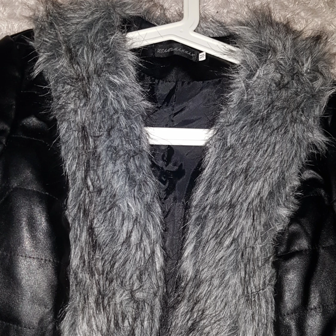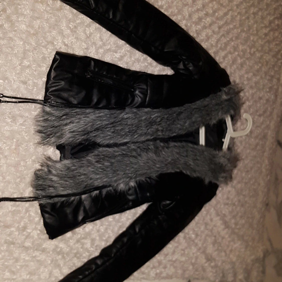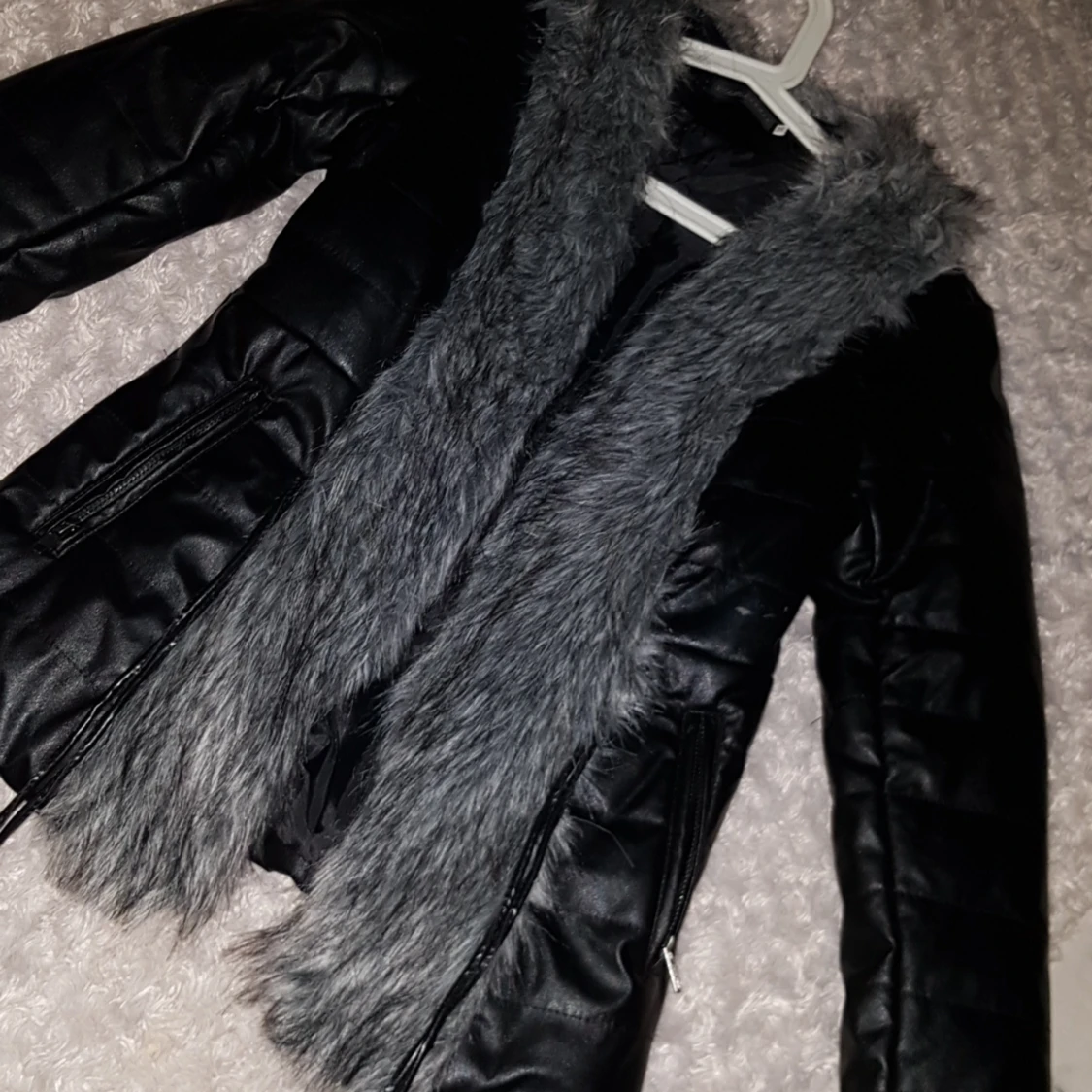 Säljer en jätte fin skinnjacka med grå päls (oäkta) i stl M. Köparen står för frakten