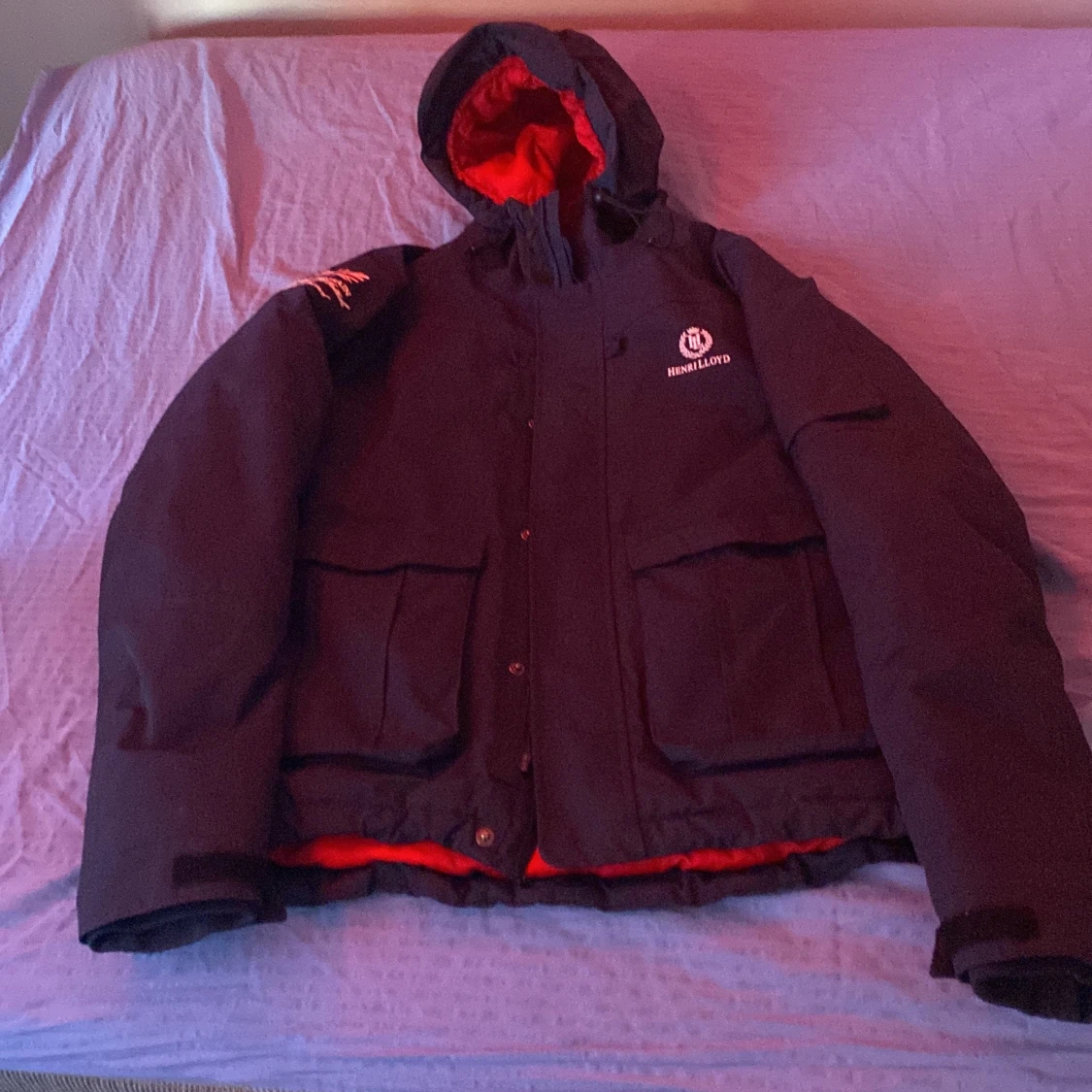 Säljer en mörk blå vinterjacka från Henri Lloyd i storlek M. Jackan har röd insida, huva och stora fickor framtill. Perfekt för kalla dagar med sin rejäla och sportiga look. Klassisk logga på bröstet och detaljer på ärmen.