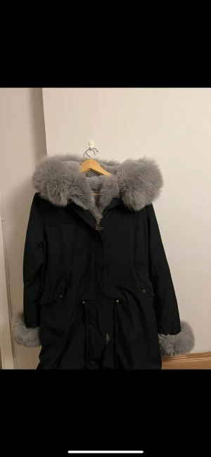 Svart garoff med grå päls. I fint skick men lätt slitning på pöls på insidan av armarna. Päls går att ta av. Armar, luva och kant framtill. Knäpps av med knappar. Längd 80 cm, bystvid ca 104 cm ny pris vad 4363. Använd en sesång men vatvat med andra jacko