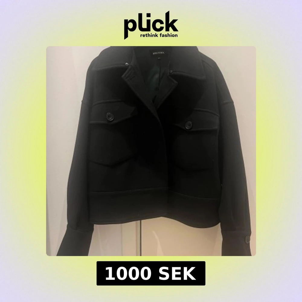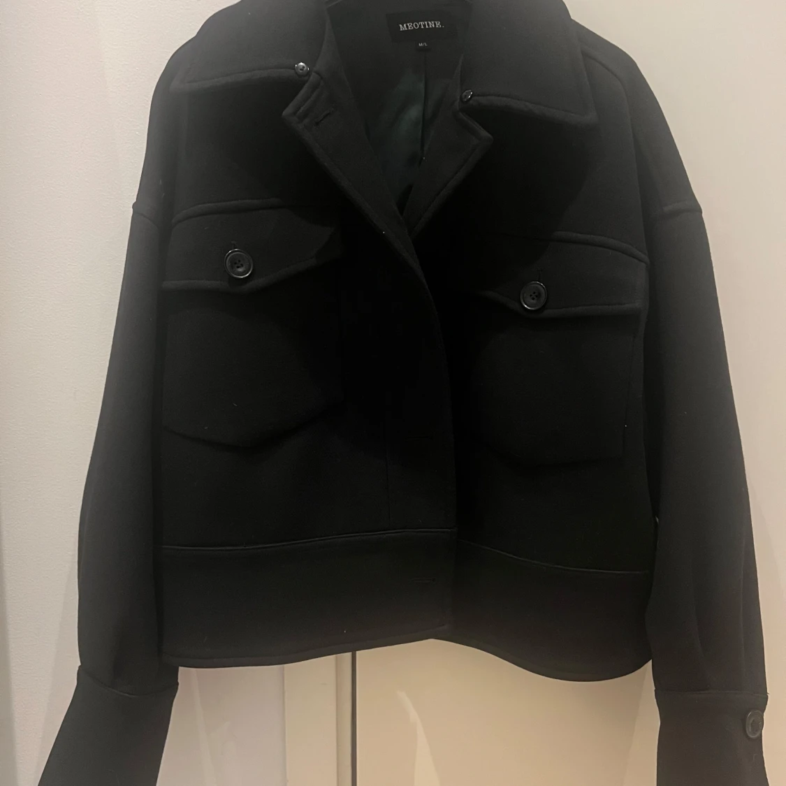 Stilren svart jacka från Meotine med stora bröstfickor och knappar framtill. Jackan har en boxig, croppad passform och klassisk krage. Perfekt för lager-på-lager och enkel att styla till olika outfits. Pälskragen finns också, bara inte med på bilden