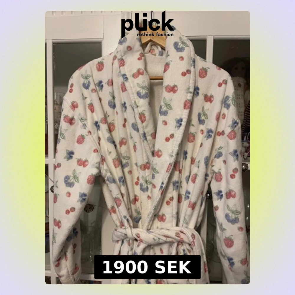Säljer en vit frottérock från Djerf Avenue med gulligt fruktmönster i rött, blått och grönt. Rocken har lång ärm, bred krage och knyts med bälte i midjan. Perfekt för chill hemma och har en riktigt cozy vibe.