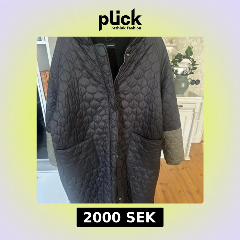 Quiltad svart kappa från M. Wiesneck med kontrasterande gröna ärmslut, stora fickor och huva. Jackan har dragkedja och tryckknappar framtill samt en oversized passform. Går ungefär till mitten av vaden/ner till foten. Har fleecefodring inuti.
