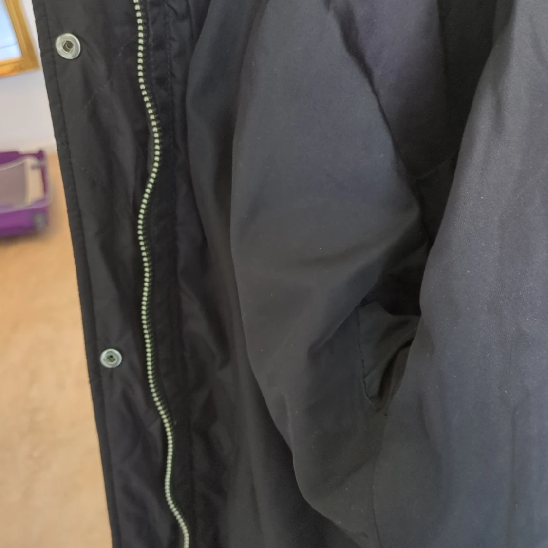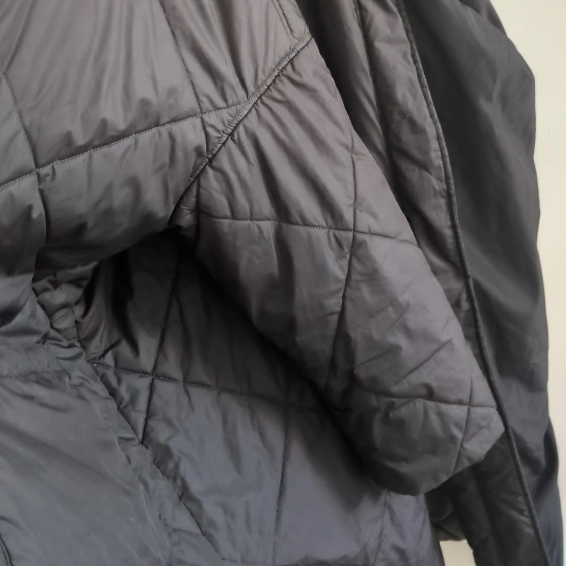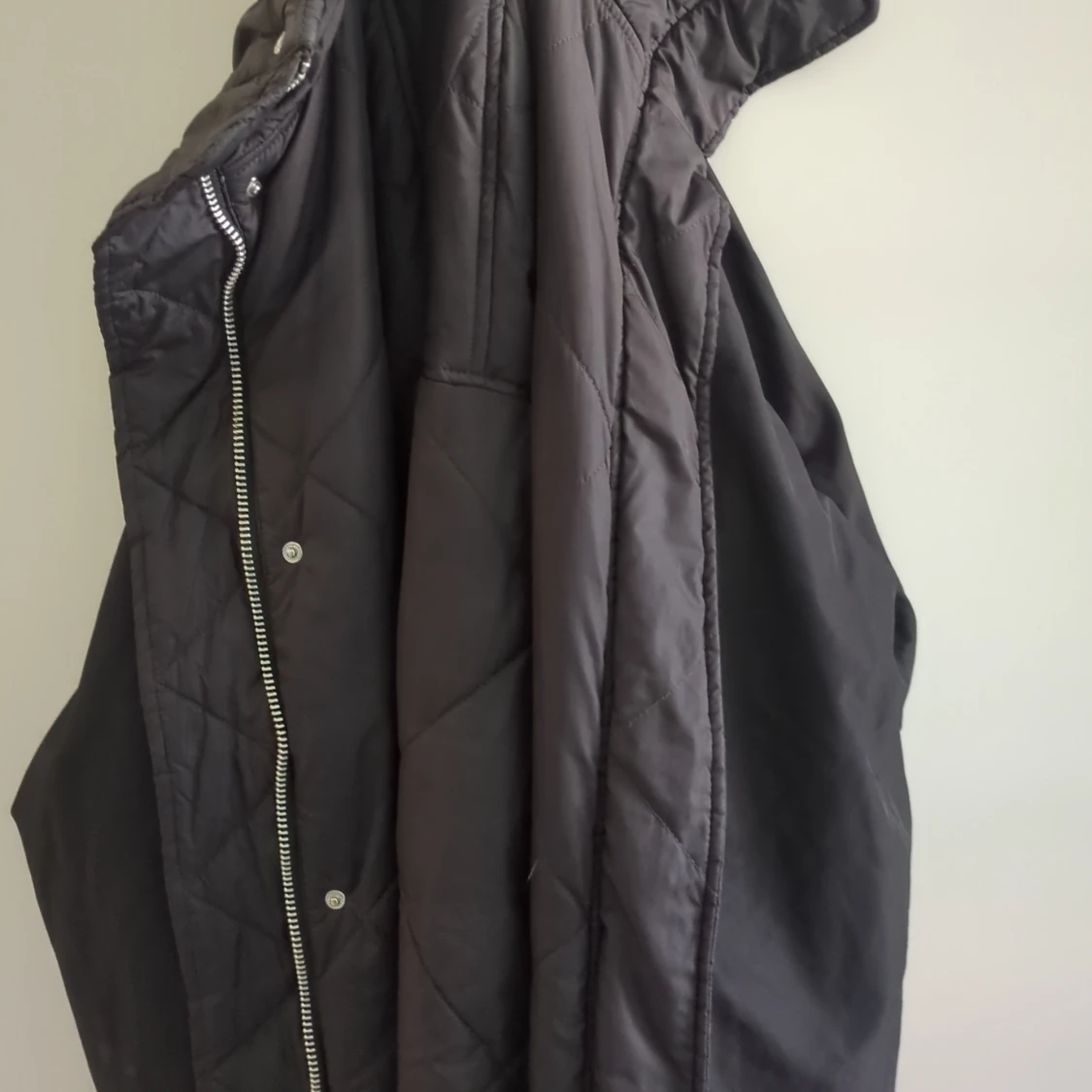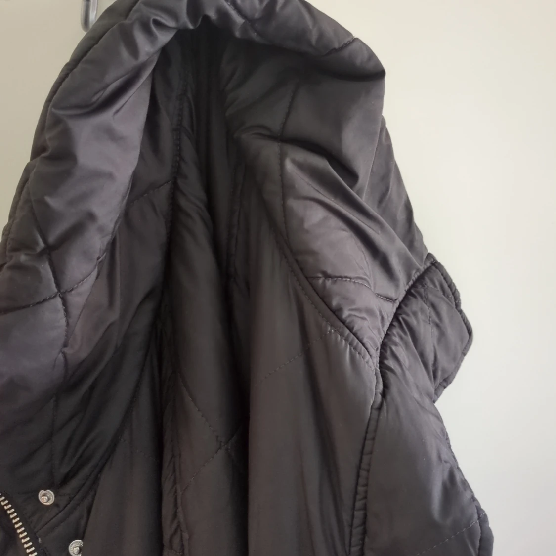 Svart pufferjacka med quiltat mönster och snygg dragkedja framtill. Jackan har långa ärmar och tryckknappar längs öppningen. Perfekt för kyliga dagar när du vill hålla stilen enkel och clean.