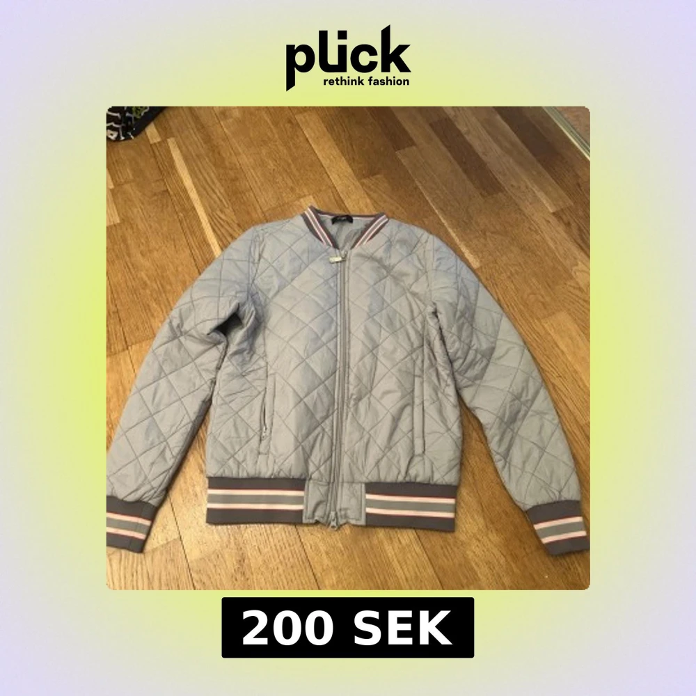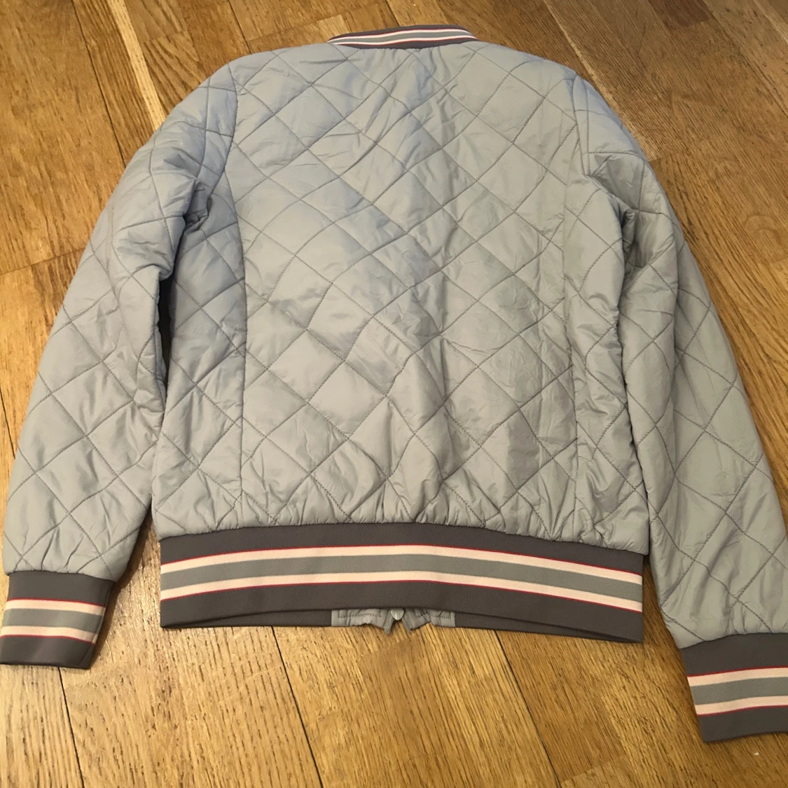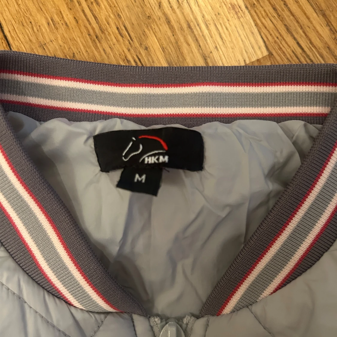Säljer en snygg grå quiltad stalljacka från HKM. Jackan har en dragkedja framtill och ribbade muddar med ränder i grått och rosa. Perfekt för kyligare dagar med sin stilrena design och bekväma passform.