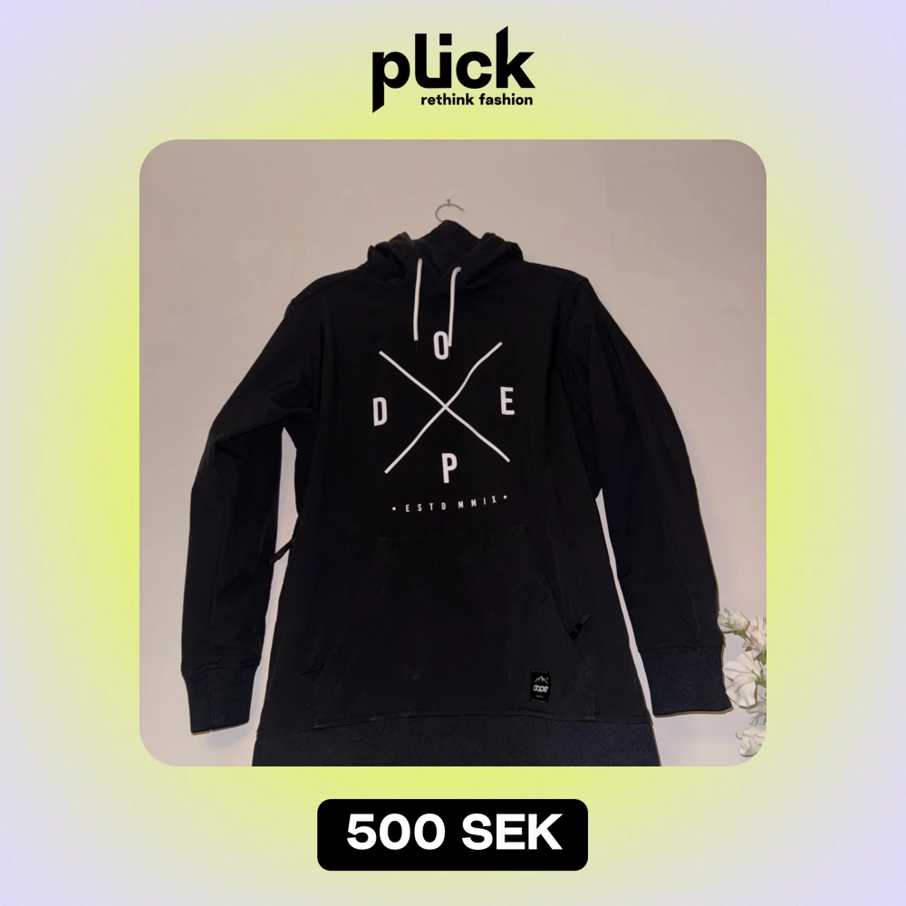 Säljer en svart snowboard jacka från Dope med vit text och grafiskt tryck på framsidan. Den har en klassisk känguruficka och justerbar huva med vita snören.