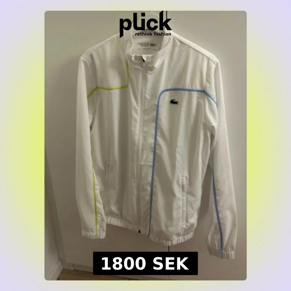 Säljer en clean vit vindjacka från Lacoste Sport med blå och gula detaljer längs ärmar och bröst. Jackan har dragkedja framtill, elastiska muddar och regular fit. Perfekt för dig som gillar sportig och stilren vibe. Klassisk krokodil-logga på bröstet.