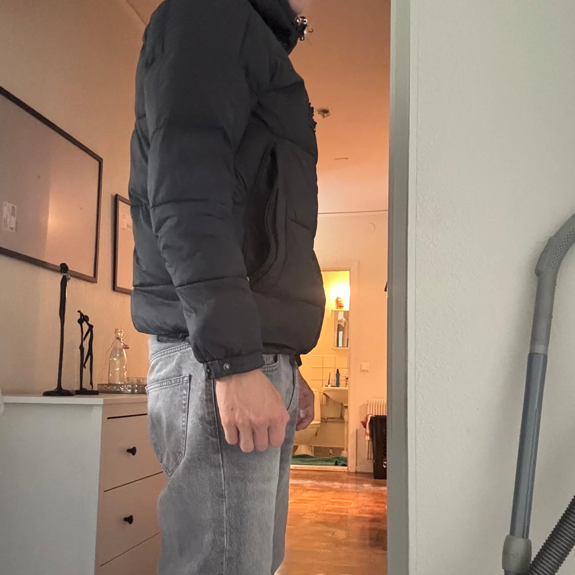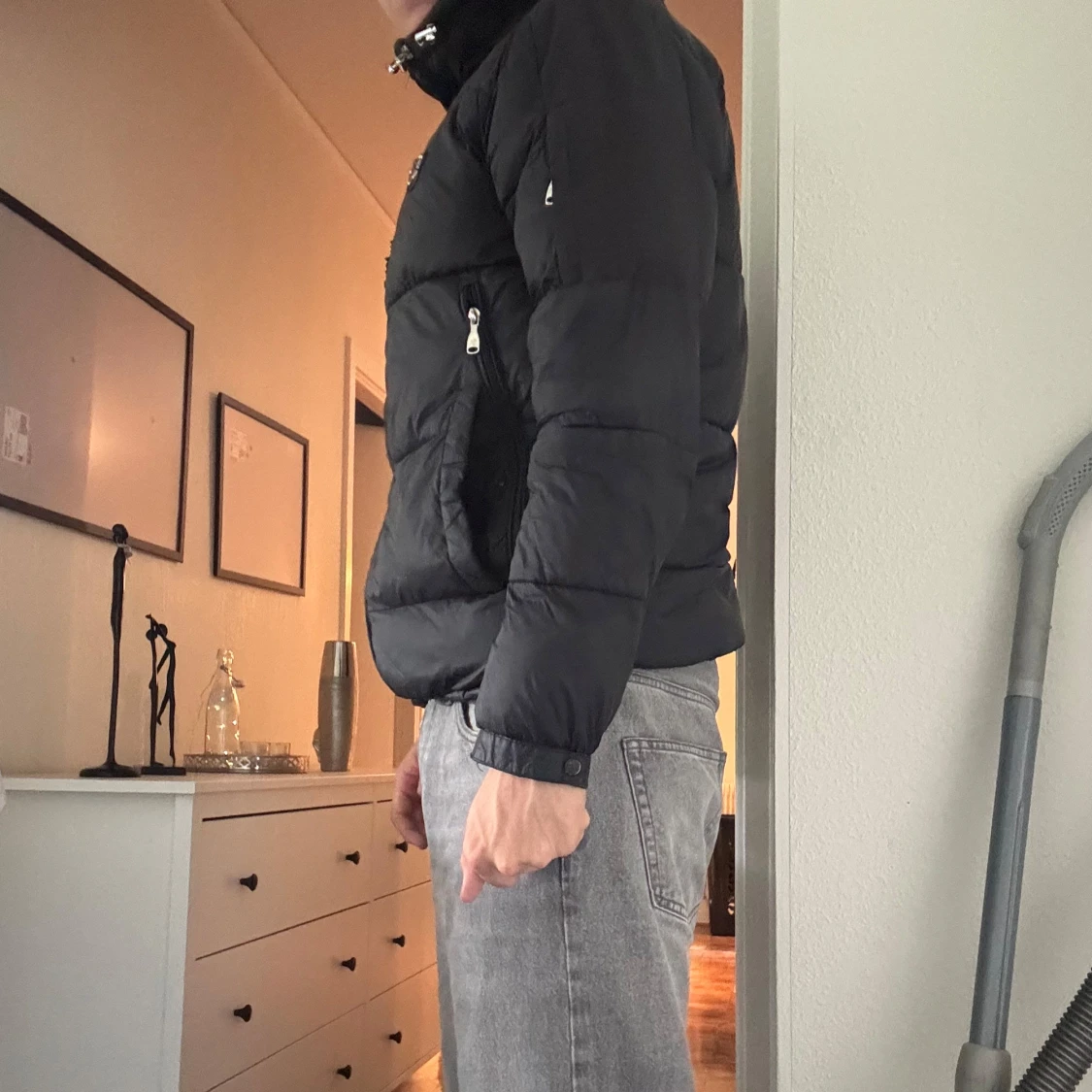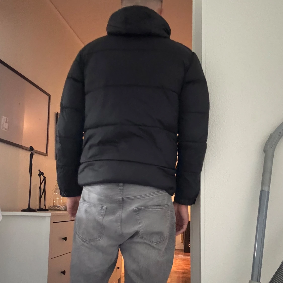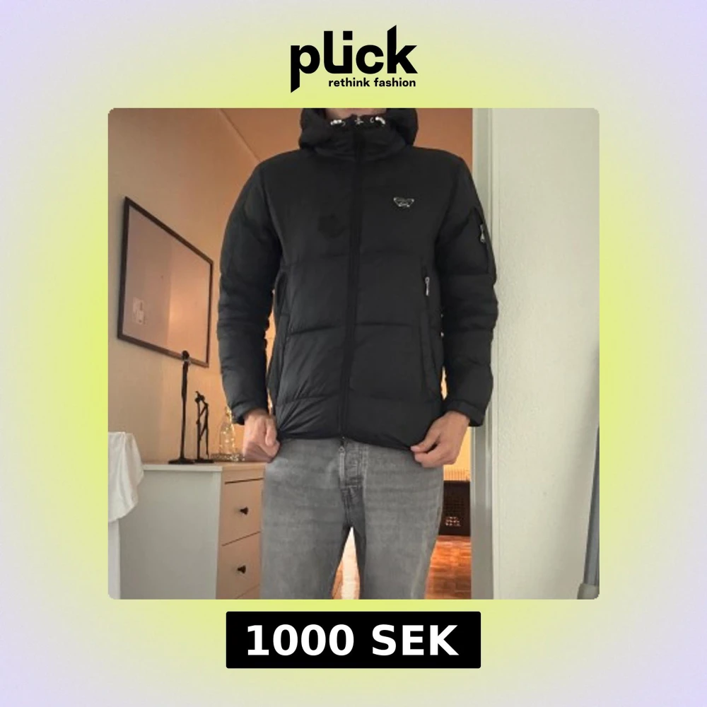 Svart pufferjacka med huva och dragkedja framtill. Jackan har quiltad design, flera fickor med dragkedja och en liten logga på bröstet. Perfekt för kalla dagar och har en klassisk, stilren look. Sen är sett ett hål i jackan som är lagat annars är det skön varm och snygg storlek m passar även L ställ frågor om ni har några