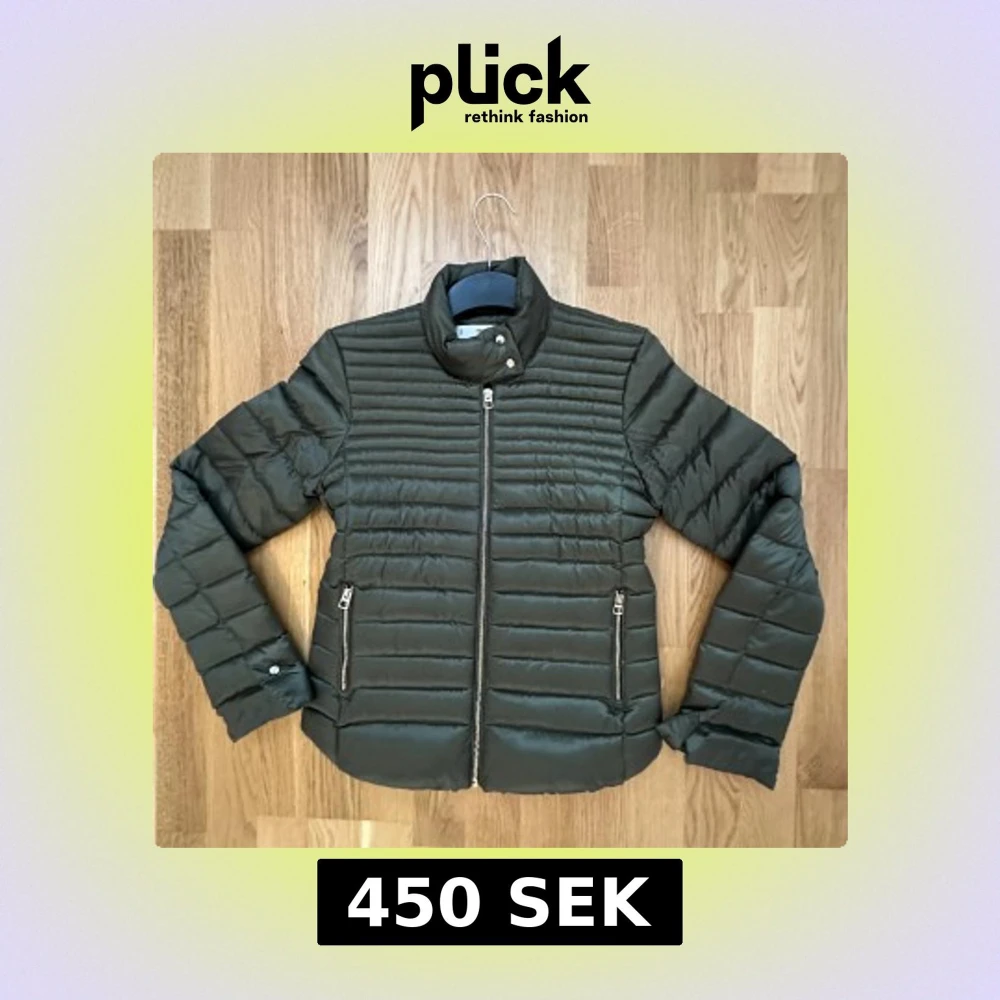 Snygg olivgrön pufferjacka med horisontella sömmar, hög krage med tryckknappar och silverfärgade dragkedjor på både fickor och framtill. Jackan har en modern, lite boxig passform och är perfekt för kyliga dagar.