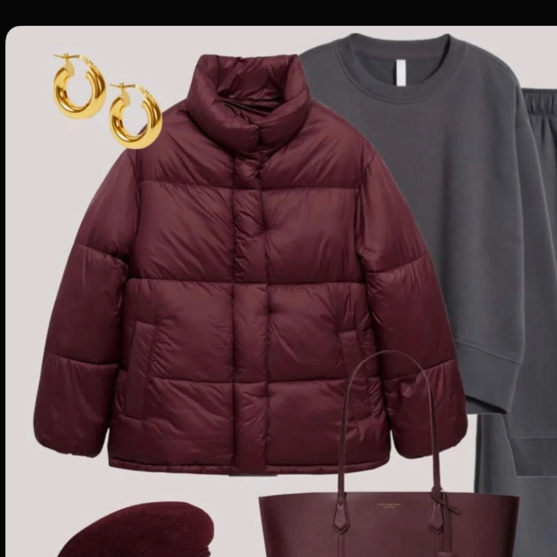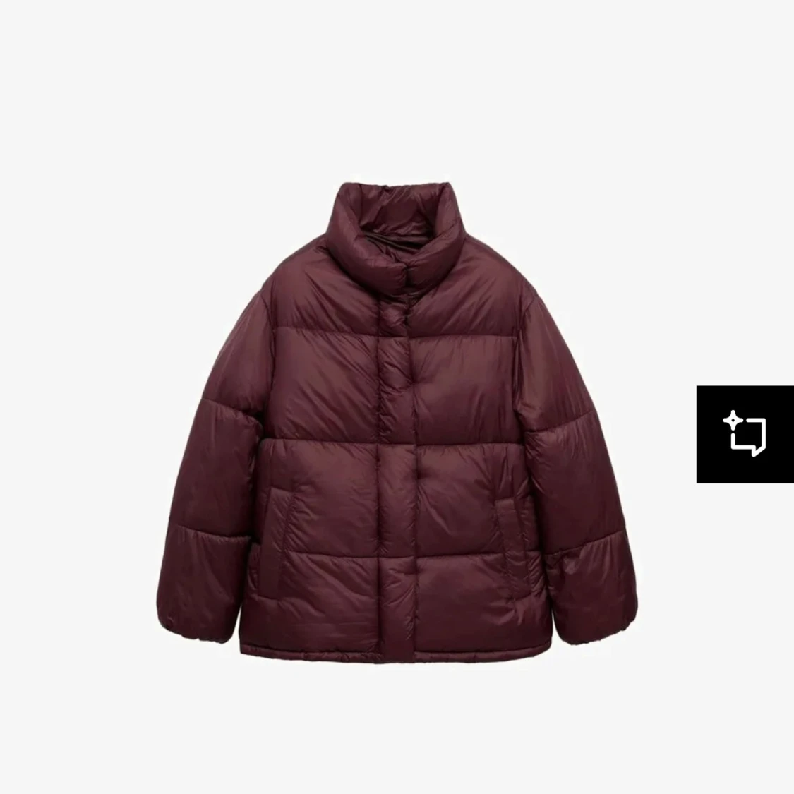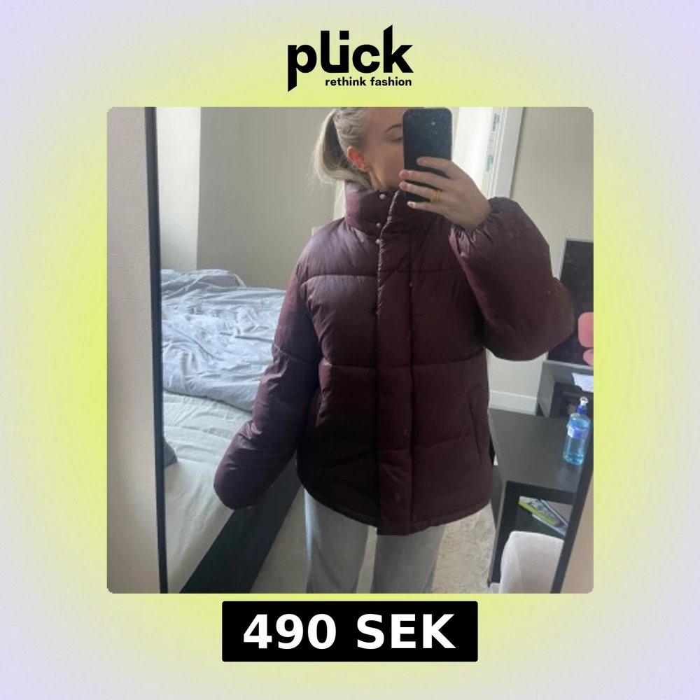 Säljer en snygg vinröd pufferjacka med hög krage och långa ärmar. Jackan har en quiltad design och stängs med knappar.