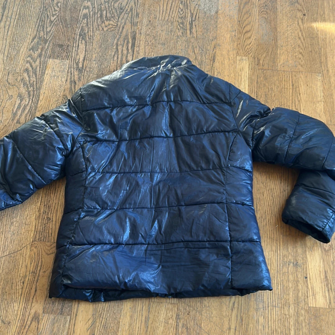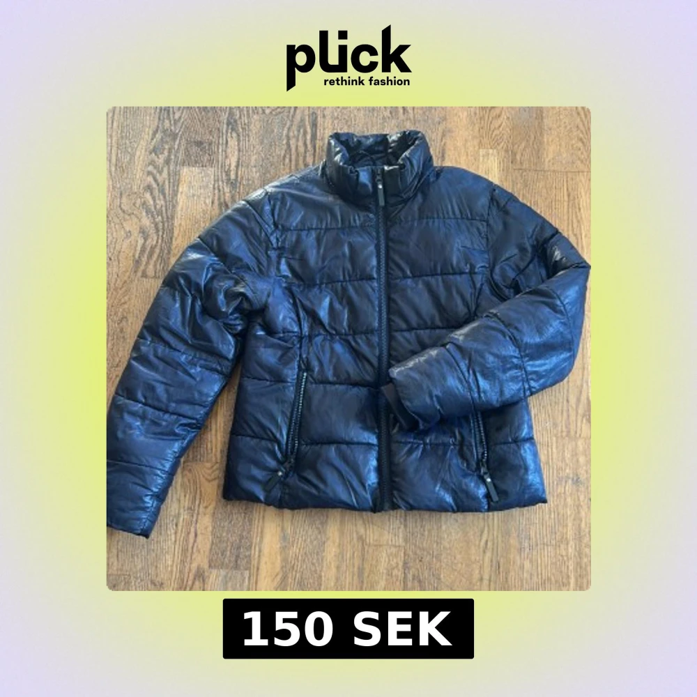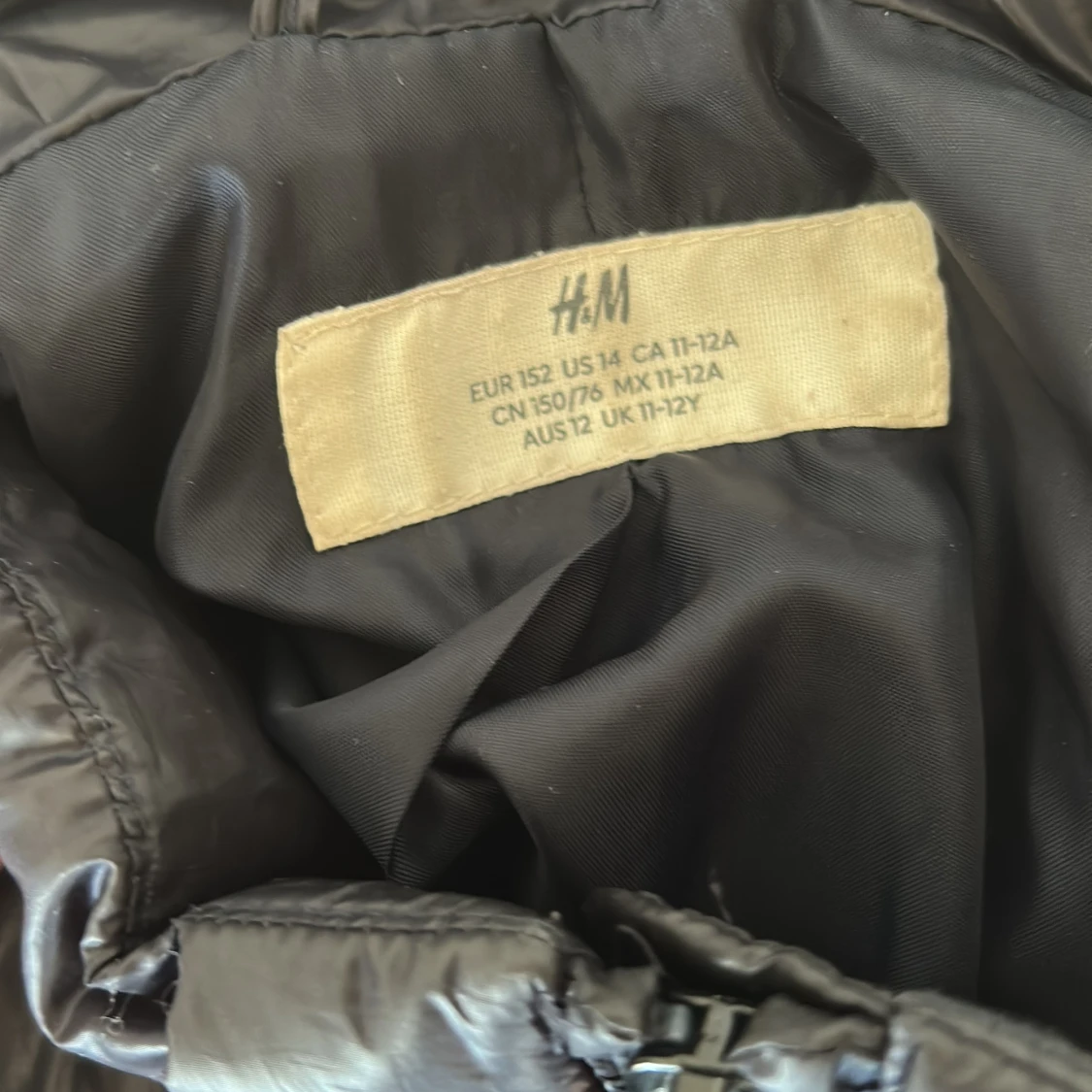 Svart pufferjacka från H&M i storlek 152. Jackan har hög krage, två dragkedjeförsedda fickor och quiltad design. Materialet är glansigt och känns lätt men ändå varmt, perfekt för kyliga dagar. Stängs med dragkedja framtill.