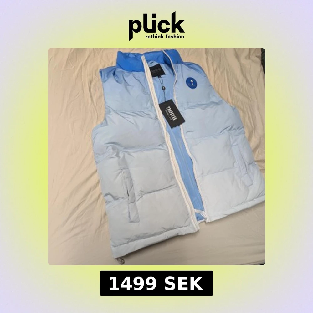 Helt ny oanvänd Trapstar väst i mycket din färg. Snygg ljusblå dunväst från Trapstar med hög krage och vit dragkedja. Västen har broderad Trapstar-logga på ryggen och rund blå patch på bröstet. Perfekt för lager-på-lager och streetwear-vibe.