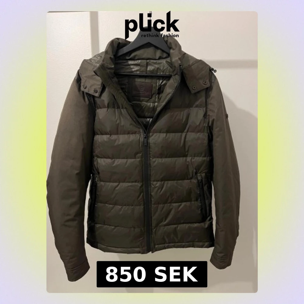 Snygg olivgrön dunjacka från Massimo Dutti med avtagbar huva och dragkedja framtill. Jackan är quiltad, har vind- och vattentätt material samt innerficka med dragkedja. Perfekt för kyliga dagar och har en clean, modern look. Storlek L men passar M!