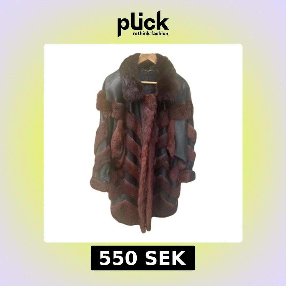 Unik pälsjacka med bred krage i mörkbrun päls och svarta skinnpaneler. Jackan har ett mönster av diagonala pälsränder över hela ytan och en lyxig känsla. Perfekt för dig som vill sticka ut med en statement piece i höst och vinter.