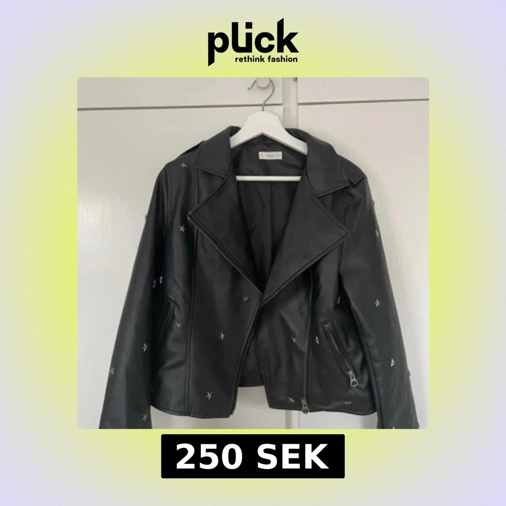 Cool svart skinnjacka från Missguided med silverfärgade stjärnor som detaljer. Jackan har bred krage, dragkedjor framtill och på fickorna, samt en croppad passform som ger en edgy vibe. Perfekt för dig som vill sticka ut med din stil. Knappt använd. Storlek M men sitter som en xs/s 💕 (Bilderna är lånade!!)
