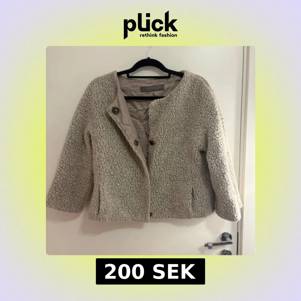 Mysig beige trekvartsjacka i teddy material från Zara Basic med knappar framtill. Fin och gosig, storlek L men liten i storleken så passar mindre oxå, kort modell💕en knapp är sönder men går lätt att sy fast