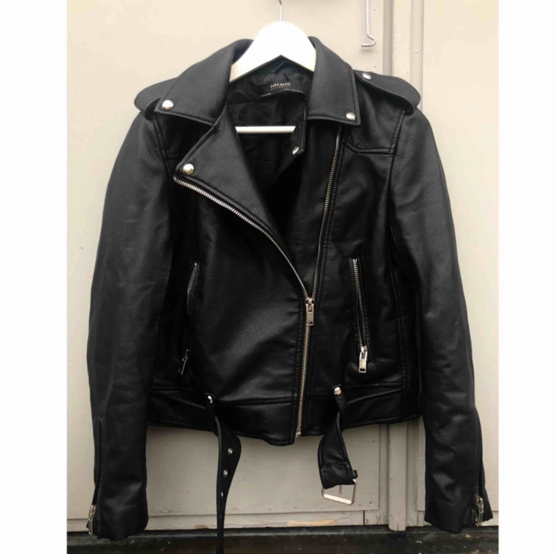 Jättesnygg och cool jacka i fejk skinn från Zara! Knappt använd, i mycket bra skick! Kan mötas upp i Stockholm eller frakta, men köparen står för frakt! Säljer pga inte min stil längre.