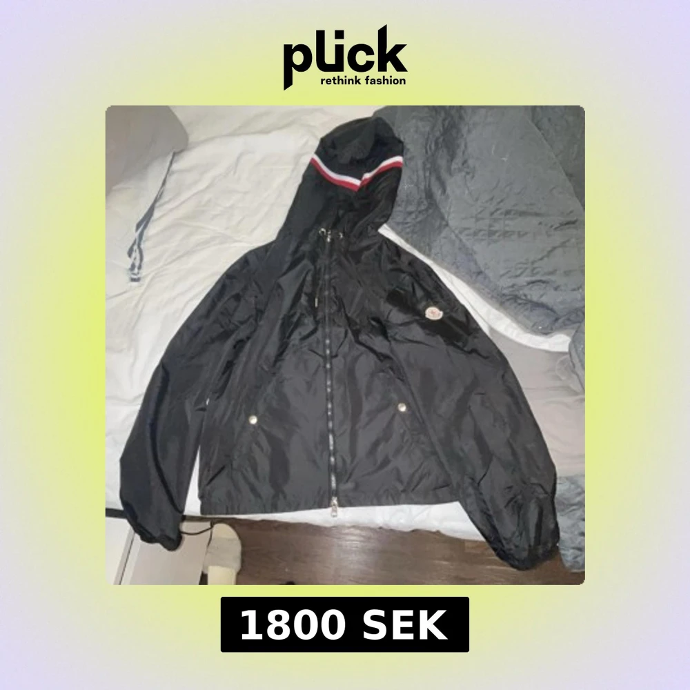 Säljer en snygg svart vindjacka från Moncler med huva och dragkedja. Jackan har en stilren design med röd och vit randdetalj på huvan. Perfekt för blåsiga dagar. Jackan är i storlek 2 den är helt ny aldrig använt